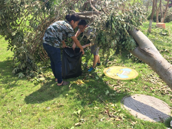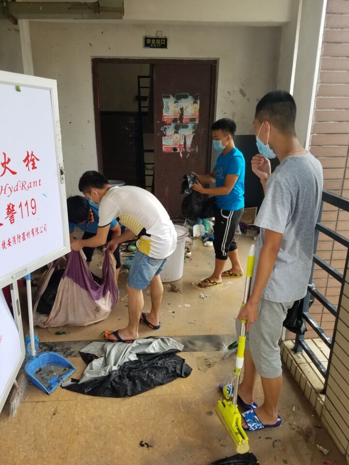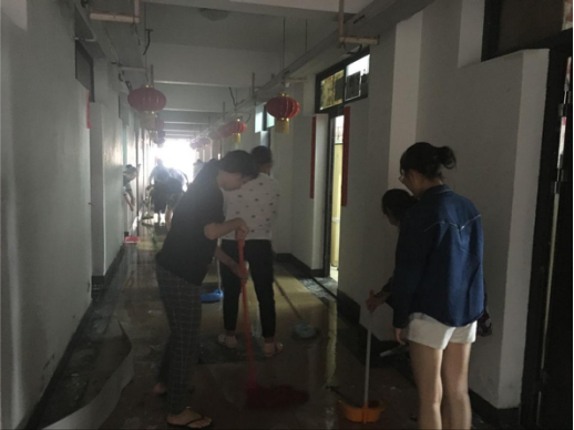 次日的早上是出奇的寂静,也许这个近15级的台风也卷走了一些中秋过后该有的热闹,在台风后的三天里,说好的放假似乎很有默契的被全校师生抛在脑后,与此同时,在头两天断电断网断水的日子里,辅导员们的关切问候温暖地落入学生的心中,“寝室还安全吗?”、“有人受伤吗?”、“二号楼教学楼有网,快去给你家里报平安吧!”。当问到辅导员是否吃早饭时,辅导员摇摇头:“等我通知完了,我再去吃。”操场宿舍外也聚集了许多自愿打扫学校卫生的志愿者,为排涝、道路清洁、宿舍检修等方面,全校每一位师生都贡献着自己的一份力量。