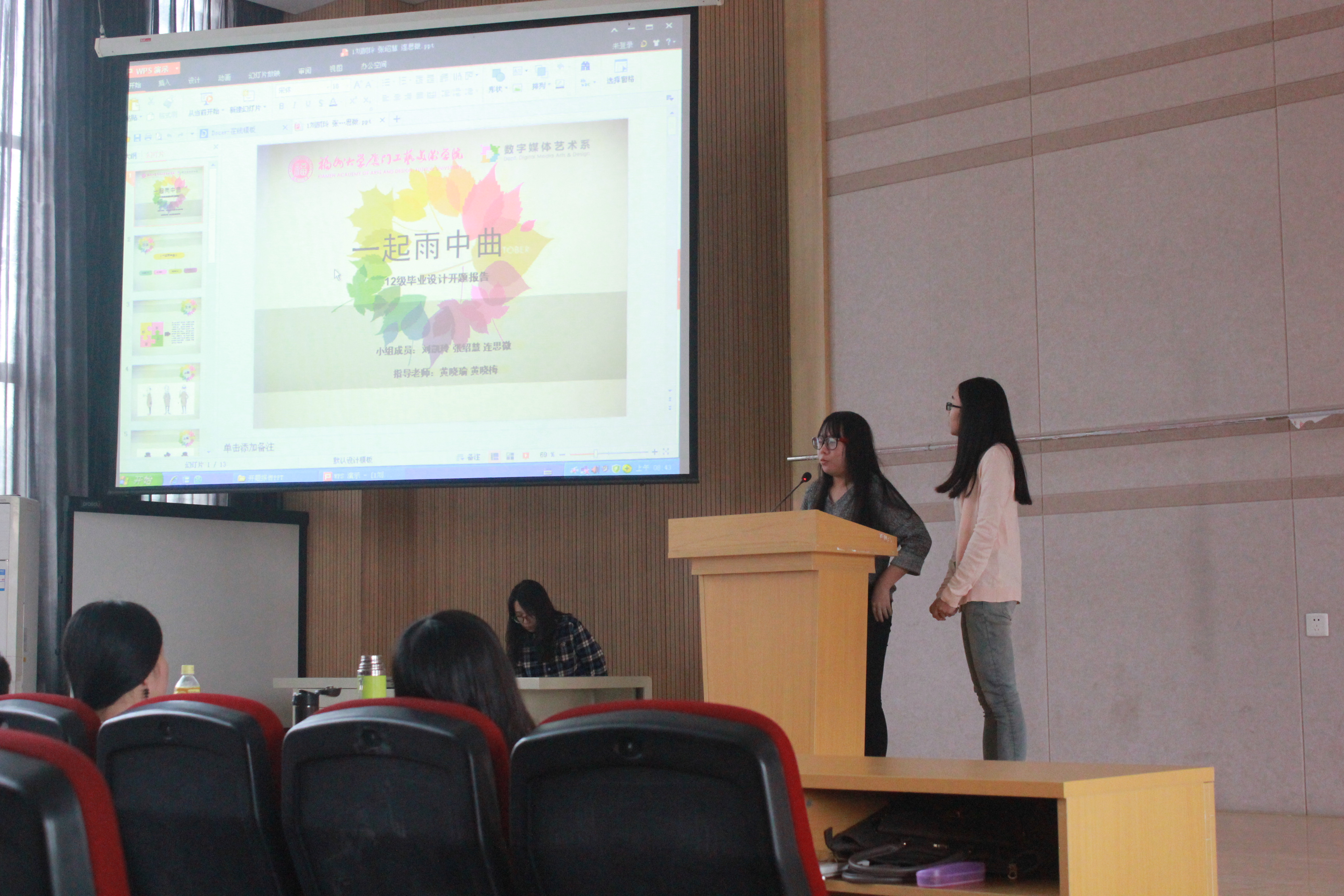 开题报告中,12级学生以毕业设计组为单位,上台作开题报告,数媒系每位教师依据评分标准分别为每组打分,会后统计核算每组成绩。系主任林建德教授会后表示,12级同学们毕业设计的进度和质量值得肯定,大家要完成好今年的毕业设计,同时在出勤考核方面还应严格遵守纪律和规定。