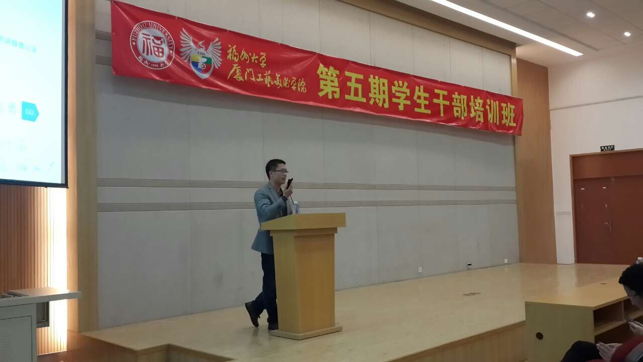 11月30日下午,肉漫 团委邀请福建师范大学团委书记陈志勇博士来肉漫 为第五期学生干部培训班授课,陈志勇老师以其本人在美国的见闻分析中美在政治经济文化教育医疗等方面的不同,结合社会主义核心价值观,深入浅出地给学生干部上了一堂精彩的爱国主义教育课,现场掌声不断。志勇老师还是新媒体应用高手、微博大V,他在现场用微博微信与同学们交流互动,并送上精美小礼品,现场气氛非常热烈!