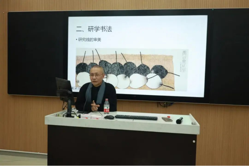 接下来,老圃先生讲到了与中国画有关的造型艺术,通过对比数位书法家的技法,先生指出:“线条要有力量和弹性,时间感和历史感,才能使书法艺术拥有更多味道。”同学们都受益匪浅,老圃先生也表达了他希望学院的学生能够深入研究书法艺术的愿景,让书法艺术在世界范围内发扬光大。
