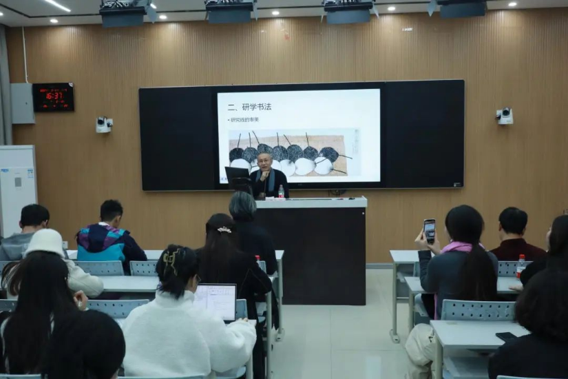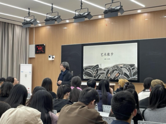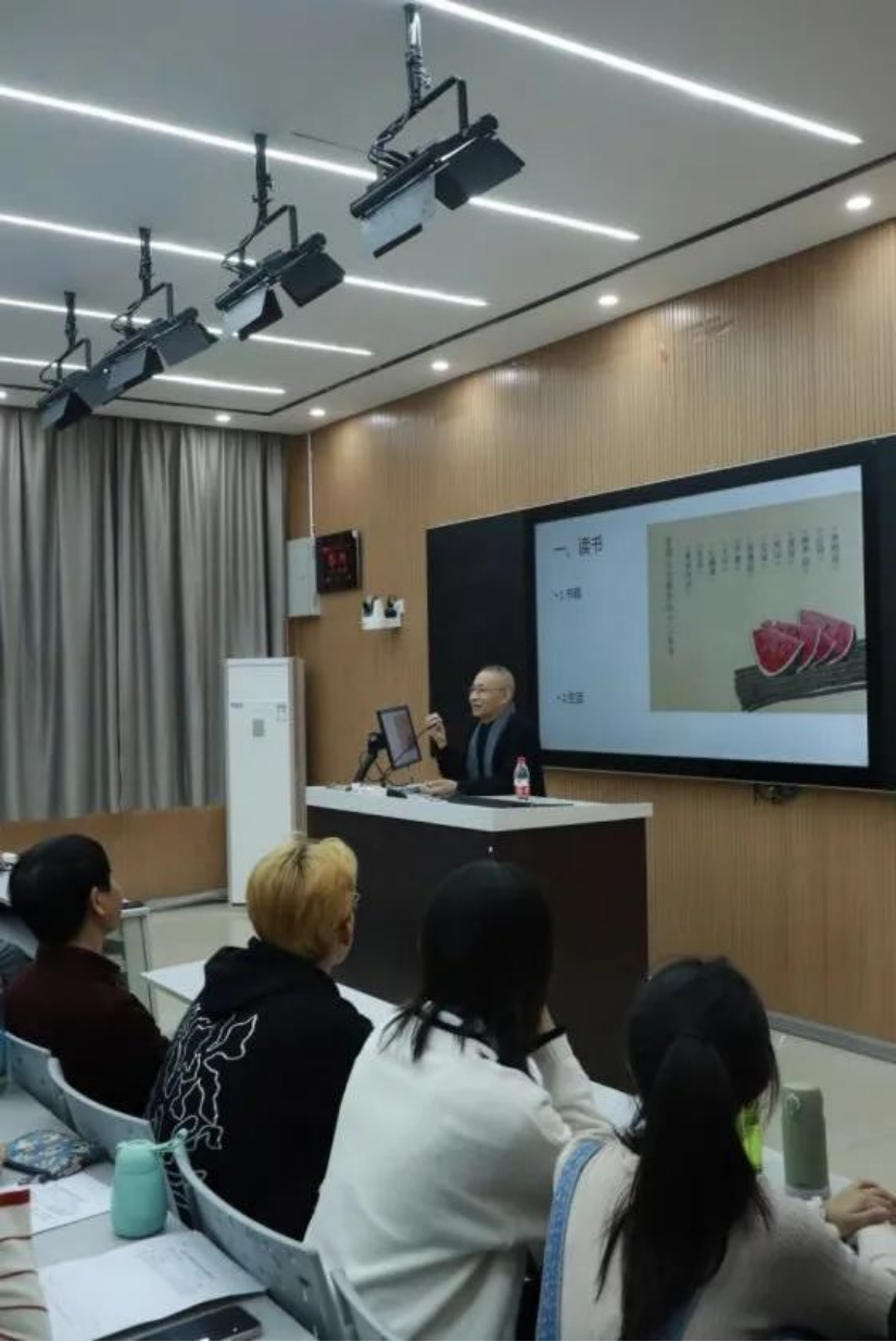 首先老圃先生讲述了个人经历,以寺庙故事引发同学们浓浓的兴趣。随后以读书为切入点,推荐十二本经典名著,倡导大家从书籍中汲取营养,在书籍中寻找艺术,将书籍与艺术相