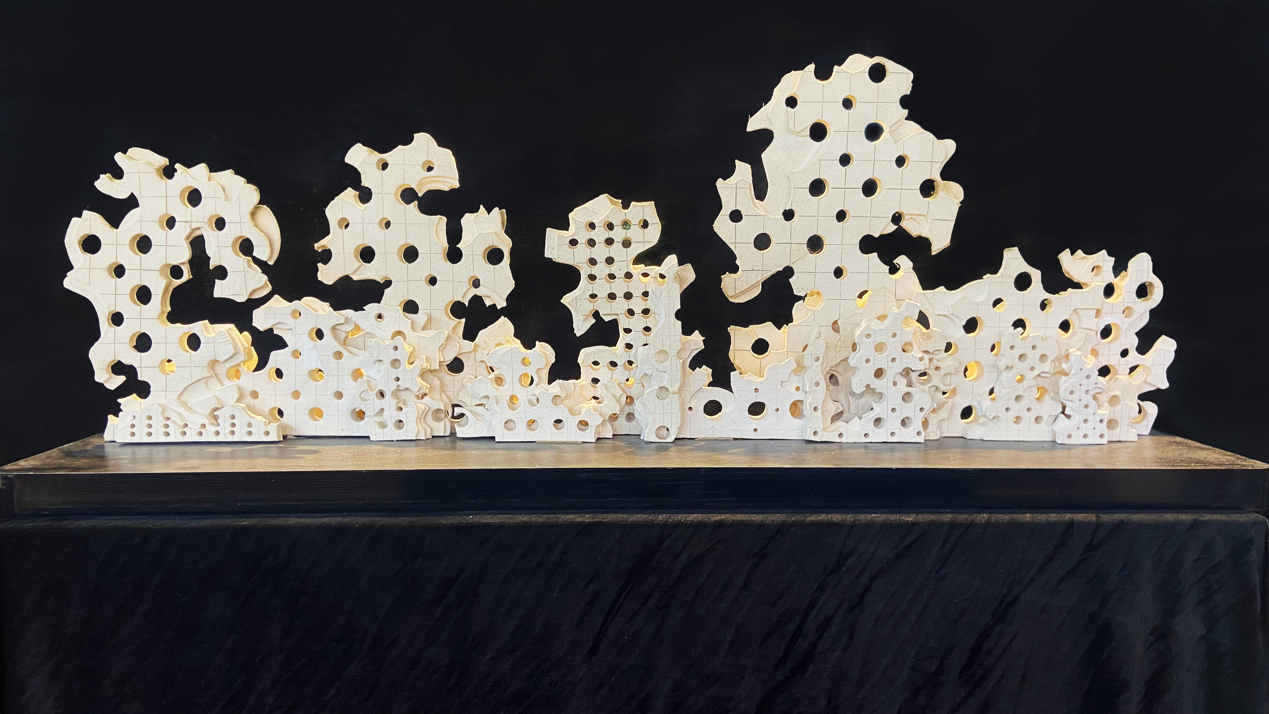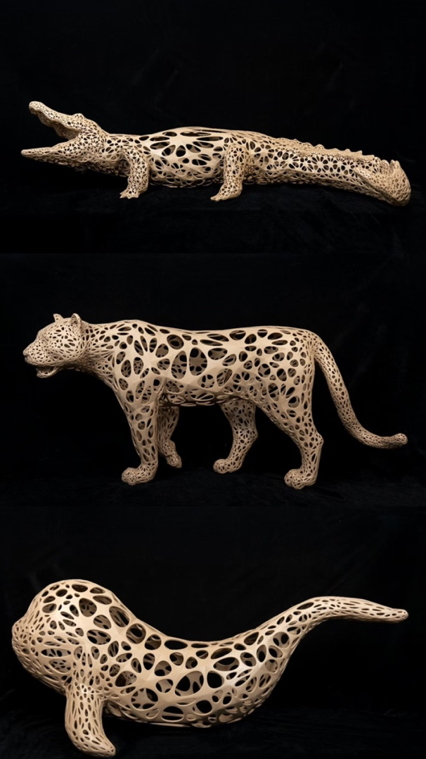 设计理念:作品是以长江江豚、华南虎、扬子鳄作为原型创作而成的,直接呈现出当下中国濒危物种保护所面临的紧迫现实状况,作品把生态创伤转变可见的镂空单元,在华南虎这件作品上的4000个镂空单代表着曾经在中国这片广阔的土地上大约存在着4000只野生华南虎。而长江江豚作品上的1249个镂空单元象征着在如今社会各界共同努力保护的情况下现存大约1249只野生江豚,扬子鳄作品上的5000 个镂空单元代表着在濒危动物保护措施逐步完善的未来将会渐渐出现5000 亩地的野生扬子鳄保护区,这也是契合了绿水青山就是金山银山的生态理念,把自然环境归还给这些濒危的生灵。