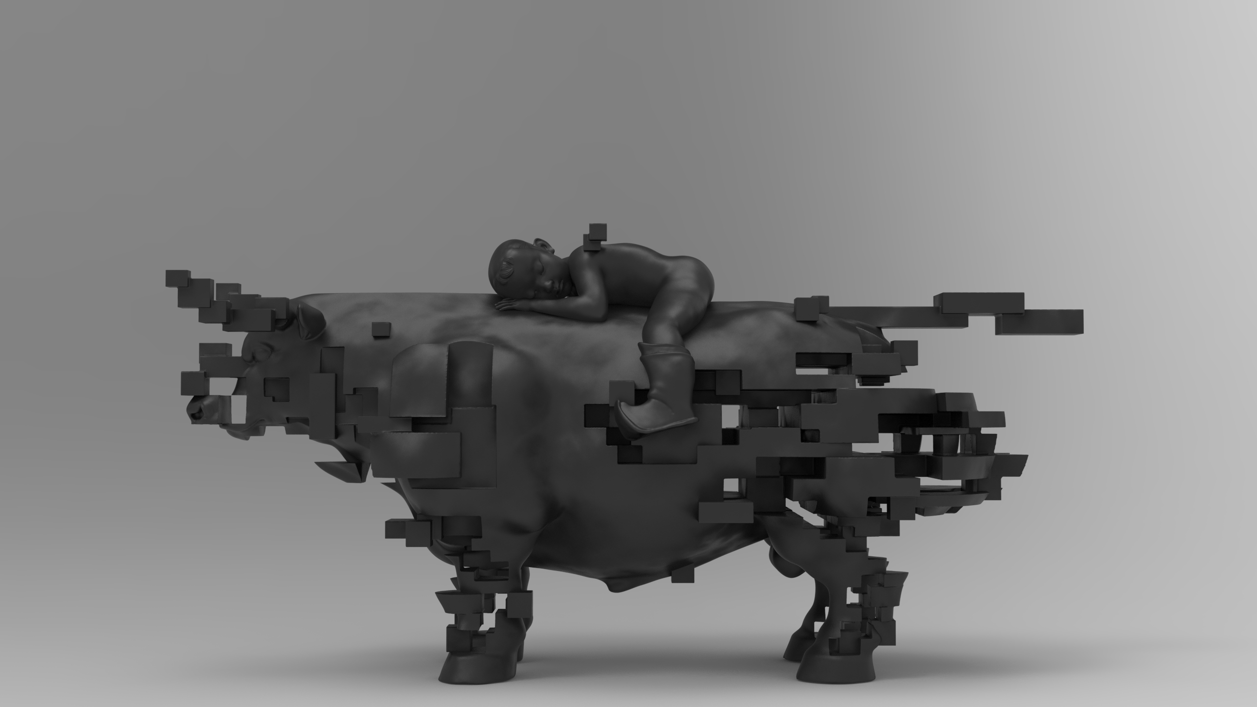 设计理念:雕塑立意为怀念童年时在草原上无忧无虑宁静悠长,用几何重叠雕塑语言表现童年记忆的逐渐破碎消散。雕塑本体为一个小孩幽静躺在牛背上休憩,牛的形体健硕有力,目视前方。而牛的身体运用写实概括手法逐渐向末端牛蹄牛尾处分解重组成四方形几何体重叠,就好似逐渐破碎模糊的记忆慢慢被淡忘。