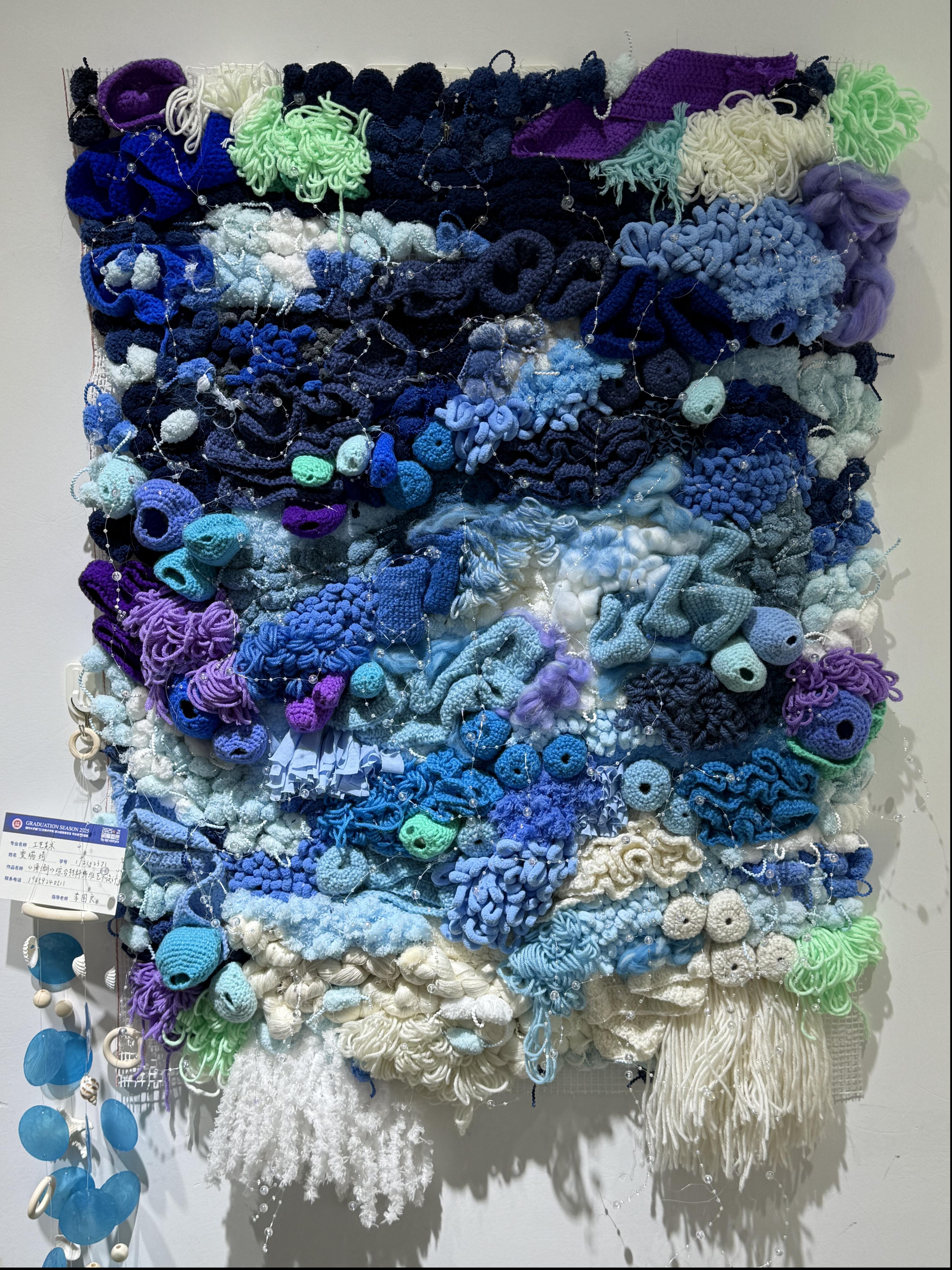 设计理念:本作品以海洋潮汐为灵感,通过纤维艺术与综合材料的创新结合,探索自然动态的视觉转化。运用编织、缠绕、染色等手法,融合回收织物、天然纤维等环保材料,模拟潮汐的流动韵律与层次变化,塑造富有生命力的空间形态。作品借助触觉与视觉的双重感知,传递海洋的壮阔美感与生态脆弱性,隐喻人类与自然的共生关系。通过实验性创作实践,既展现纤维艺术在表现自然意象中的独特优势,也呼吁观者关注海洋生态保护,以艺术语言唤醒环境责任意识。