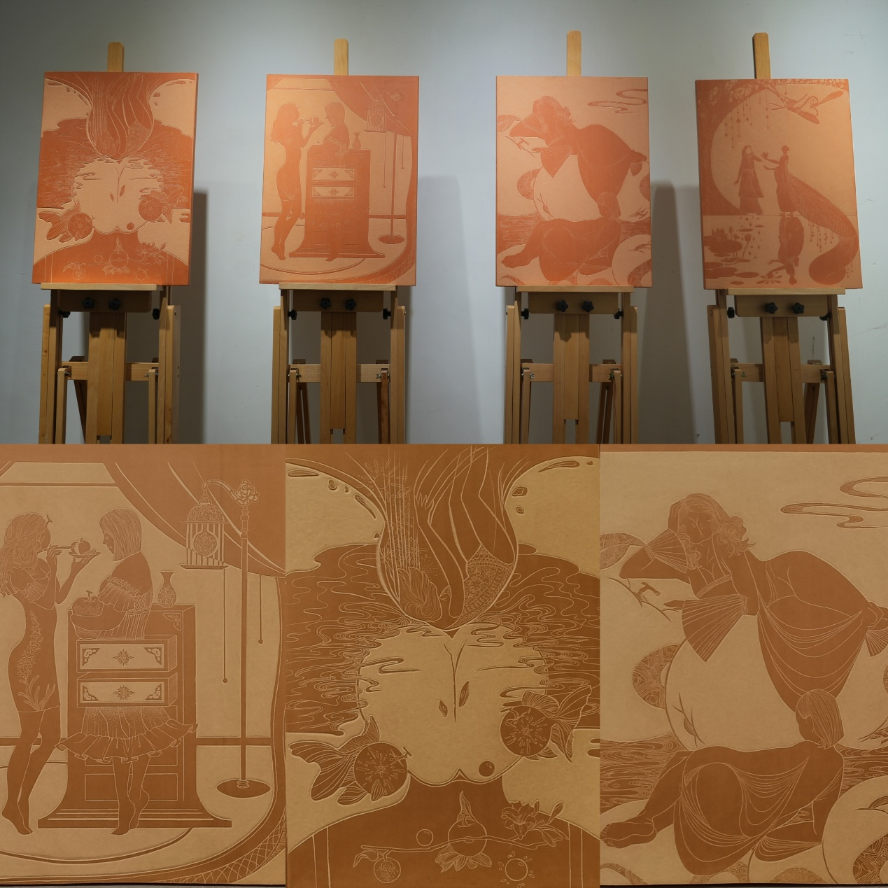 设计理念:在完成毕业设计时,我常思考:如何让承载岁月温度的闽南红砖雕,在时代浪潮中重焕光彩?最终,《苹果幻境》系列砖雕给出答案——用传统工艺讲述现代奇幻故事。初次触摸闽南红砖,其温暖色泽与细腻质感令我着迷,搭配浮雕、线刻等世代传承的技法,每一块砖雕都是闽南文化的生动见证。但我更想让这份古老技艺与当代审美共鸣。于是,我构思了少女与苹果仙女相遇的奇幻故事,通过《坠落》《引诱》《吸引》《沦陷》四幕场景,将从慌乱到沉醉的情感转变呈现在红砖之上。创作时,我拆解传统装饰元素,融入超现实叙事,既保留技法精髓,又挖掘材质特性、重新诠释符号意义。当细腻的砖雕工艺遇上奇幻故事,承载历史的红砖仿佛注入新魂,在方寸之间绽放出跨越古今的艺术魅力,也探索着传统工艺现代转型的可能。