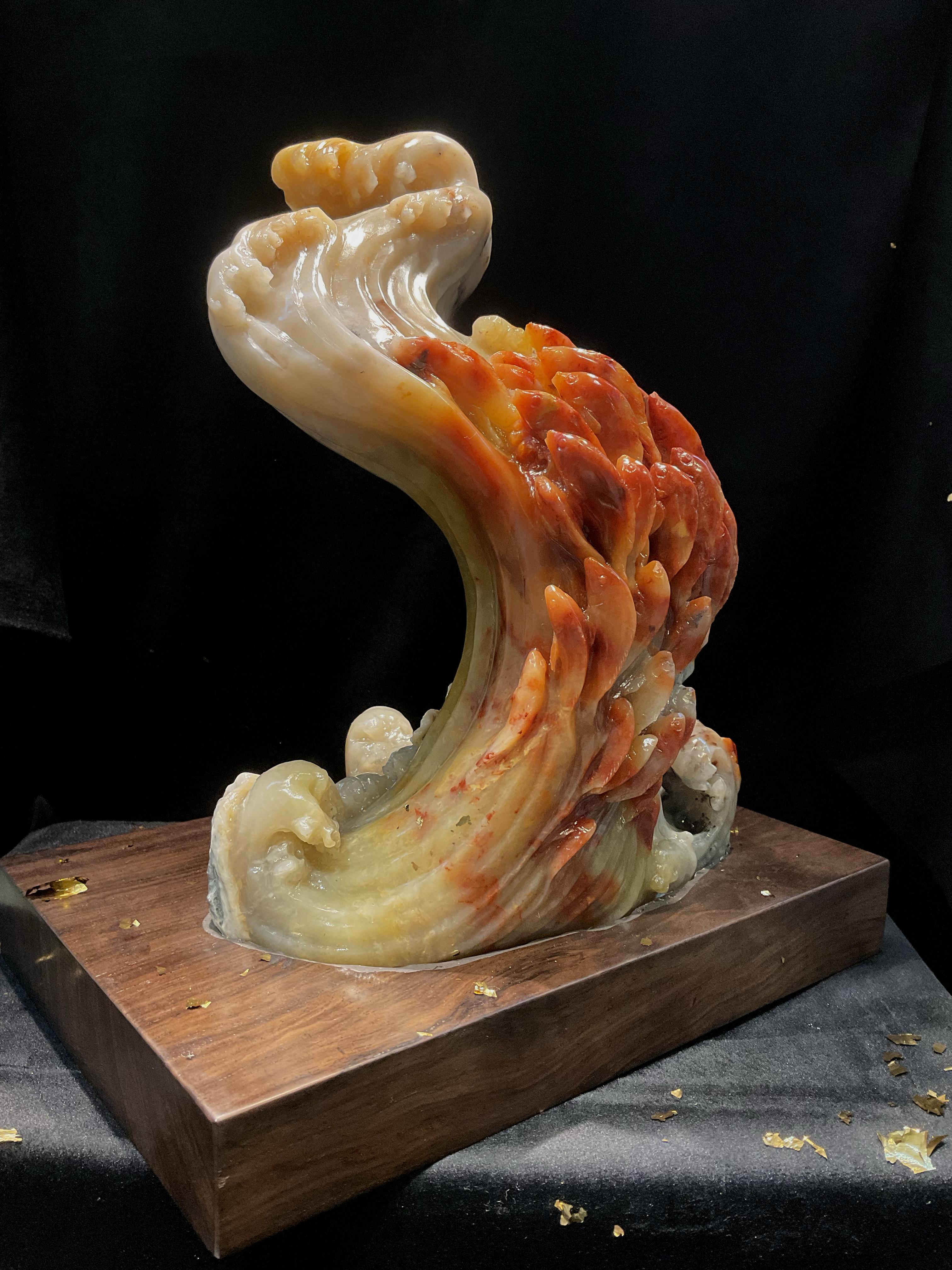 设计理念:本设计《不息》以寿山石雕刻为媒介,围绕“生命意义”与“逆流而上”的主题展开艺术表达。灵感源于现代社会中愈演愈烈的拼搏与竞争现象,探索在艰难困境中不断追寻希望的生命力量与顽强拼搏、持续进取的精神内核,象征中华民族自强不息的精神底色。