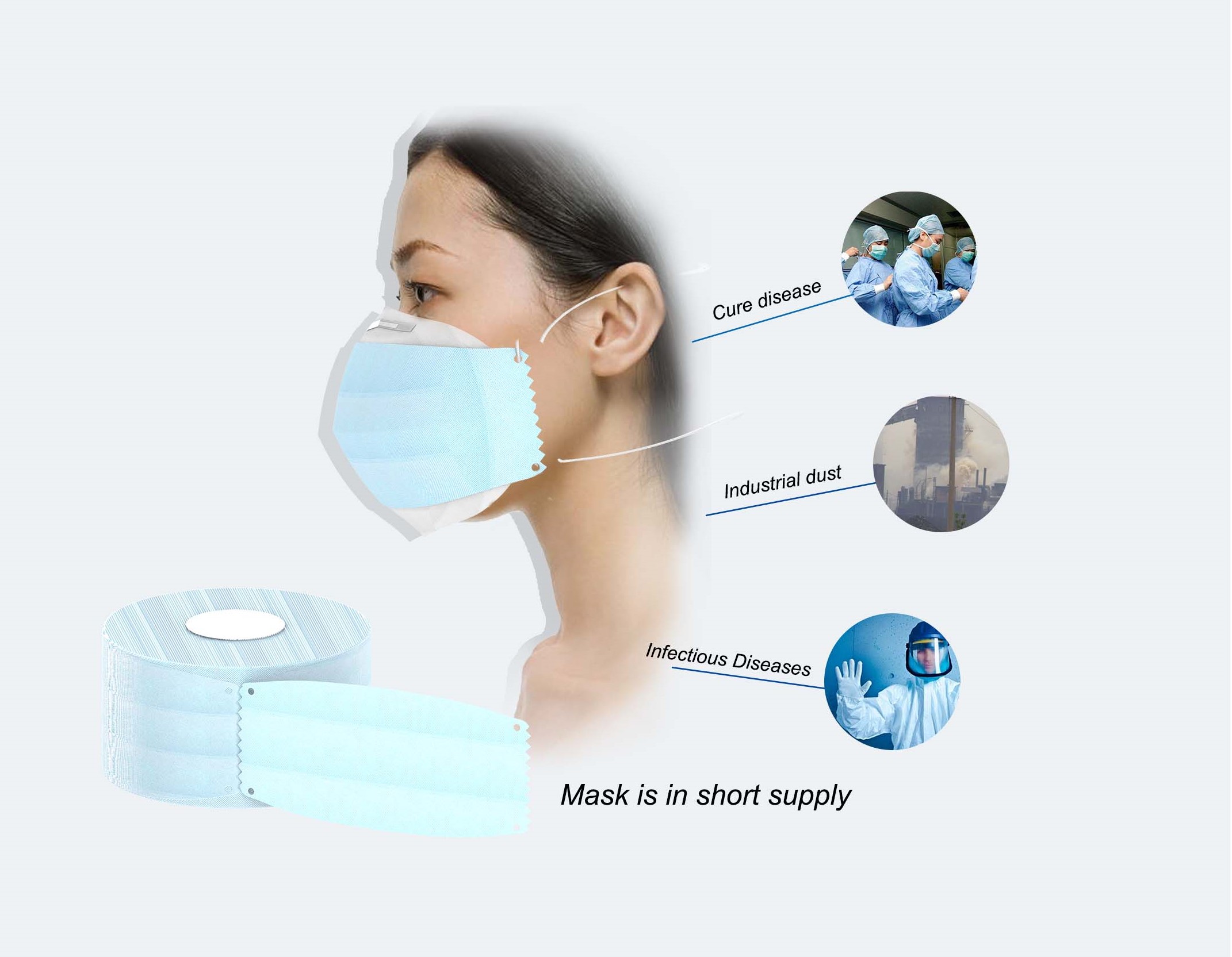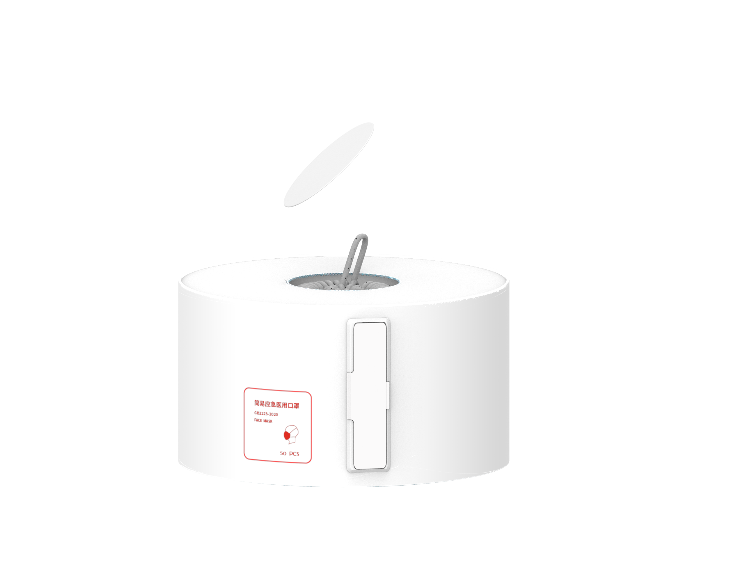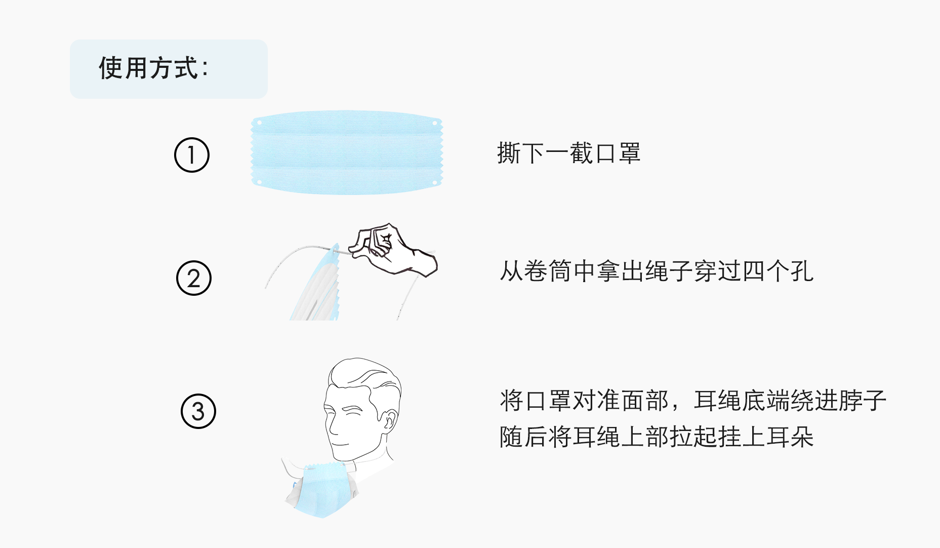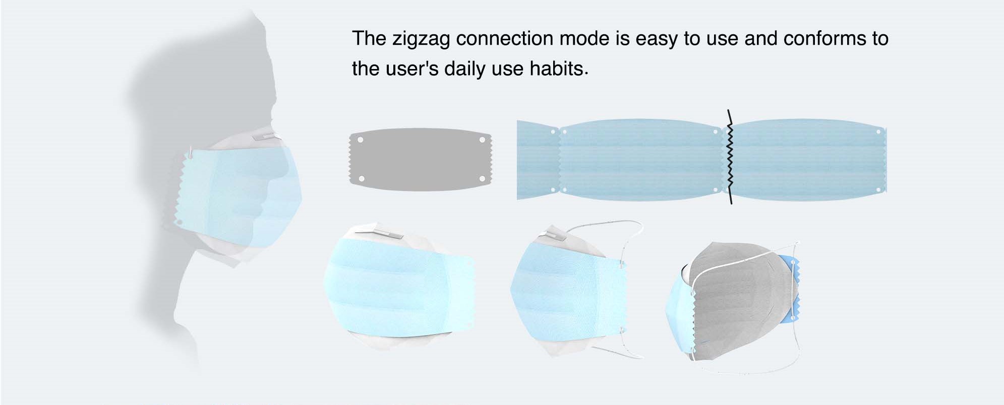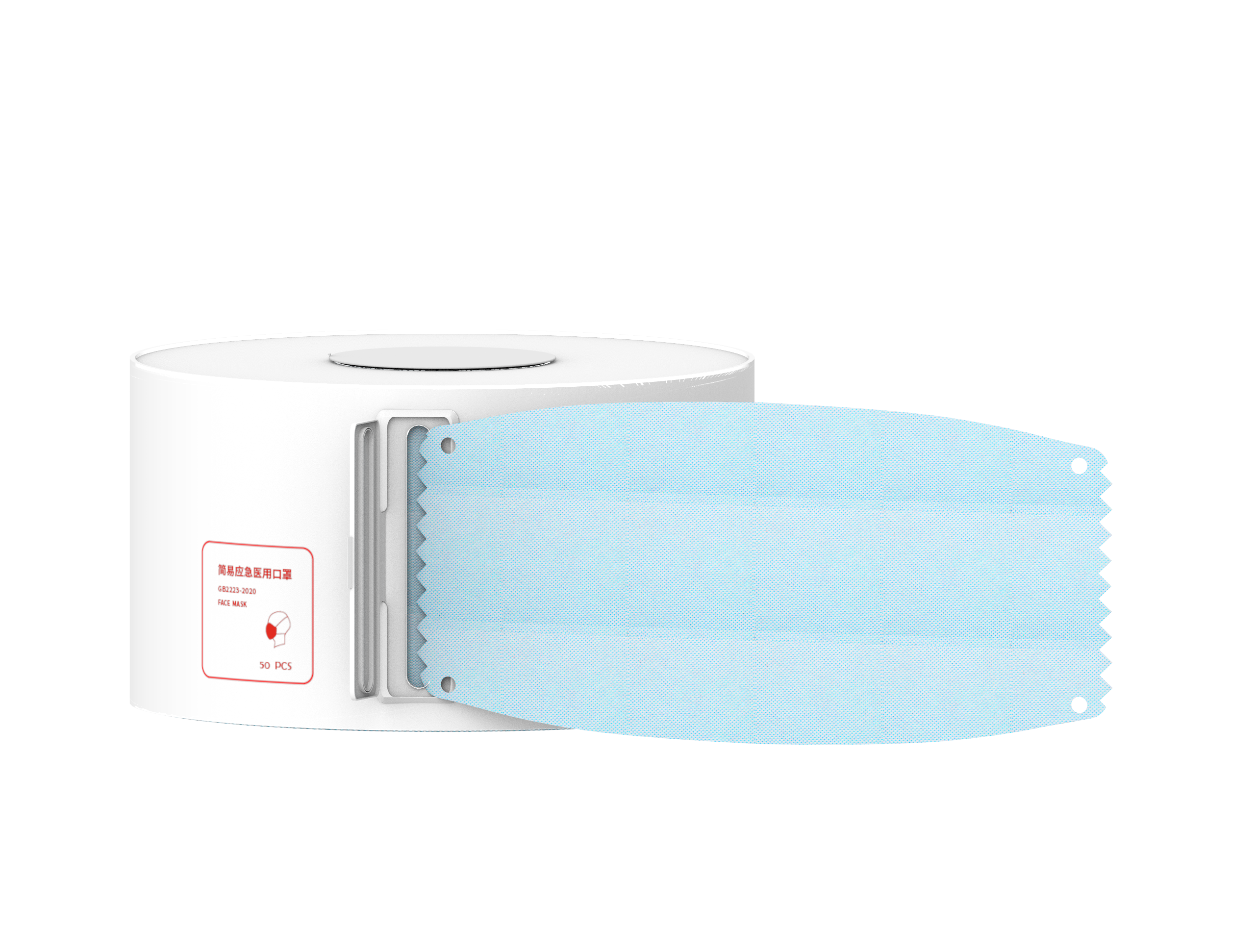 设计说明:此设计以卷筒的方式包装,仅具备口罩主体,耳绳单独放置在中间的圆筒中,使用时只需撕开一张取用,由用户自己组装佩戴。该方式可较大地提高工厂产能,在疫情特殊时期,口罩需求量较大,能够一定程度上得到缓解,提供给家庭或者企业使用。