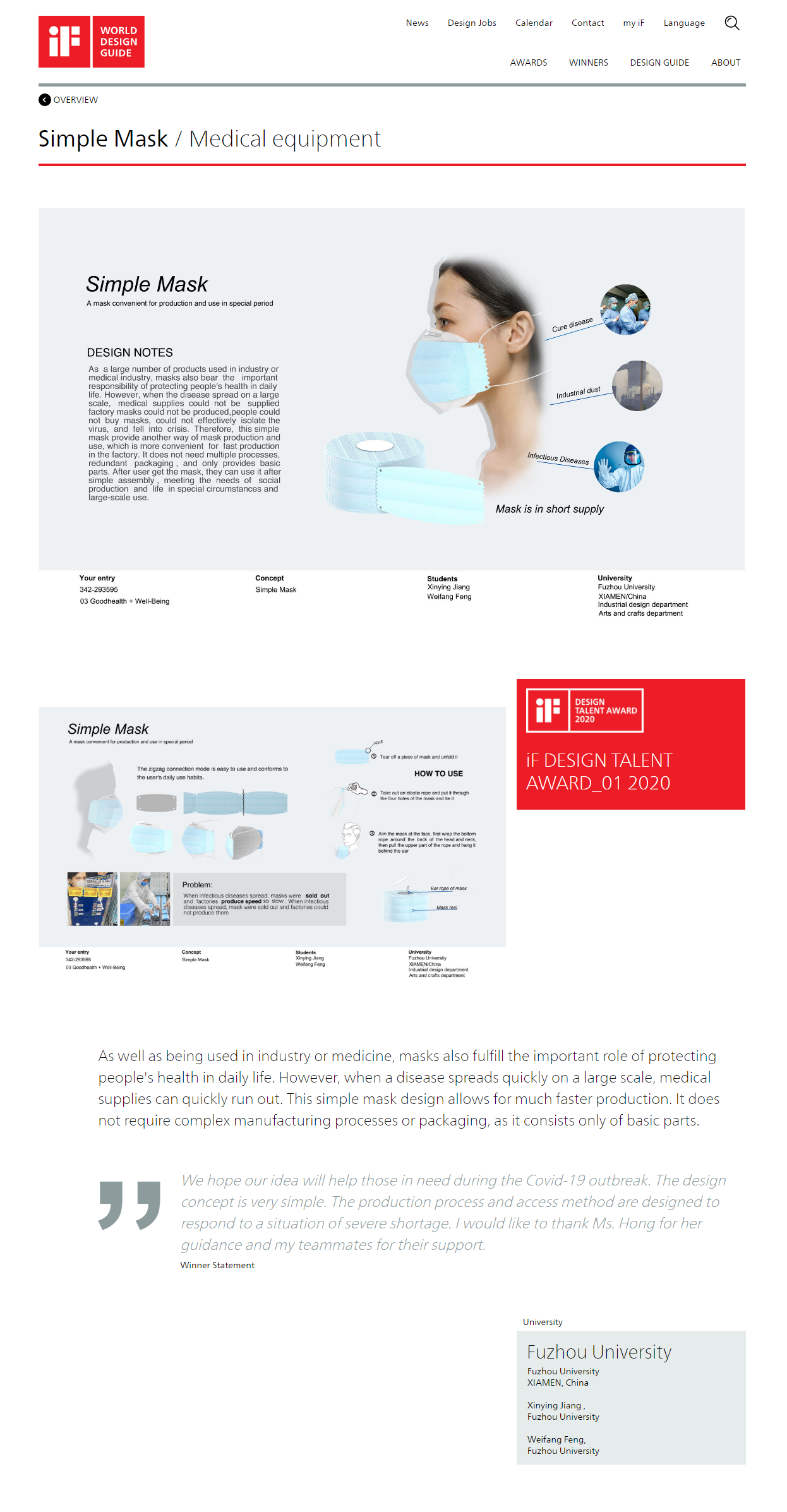 工业设计系江欣颖(19级工业设计工程)、冯炜芳(18级工业设计工程)两位同学的作品《Simple Mask》在全球50多个国家逾万件作品中脱颖而出,斩获2020IF新秀奖(iF DESIGN TALENT AWARD 2020),成为全球112名获奖者之一。