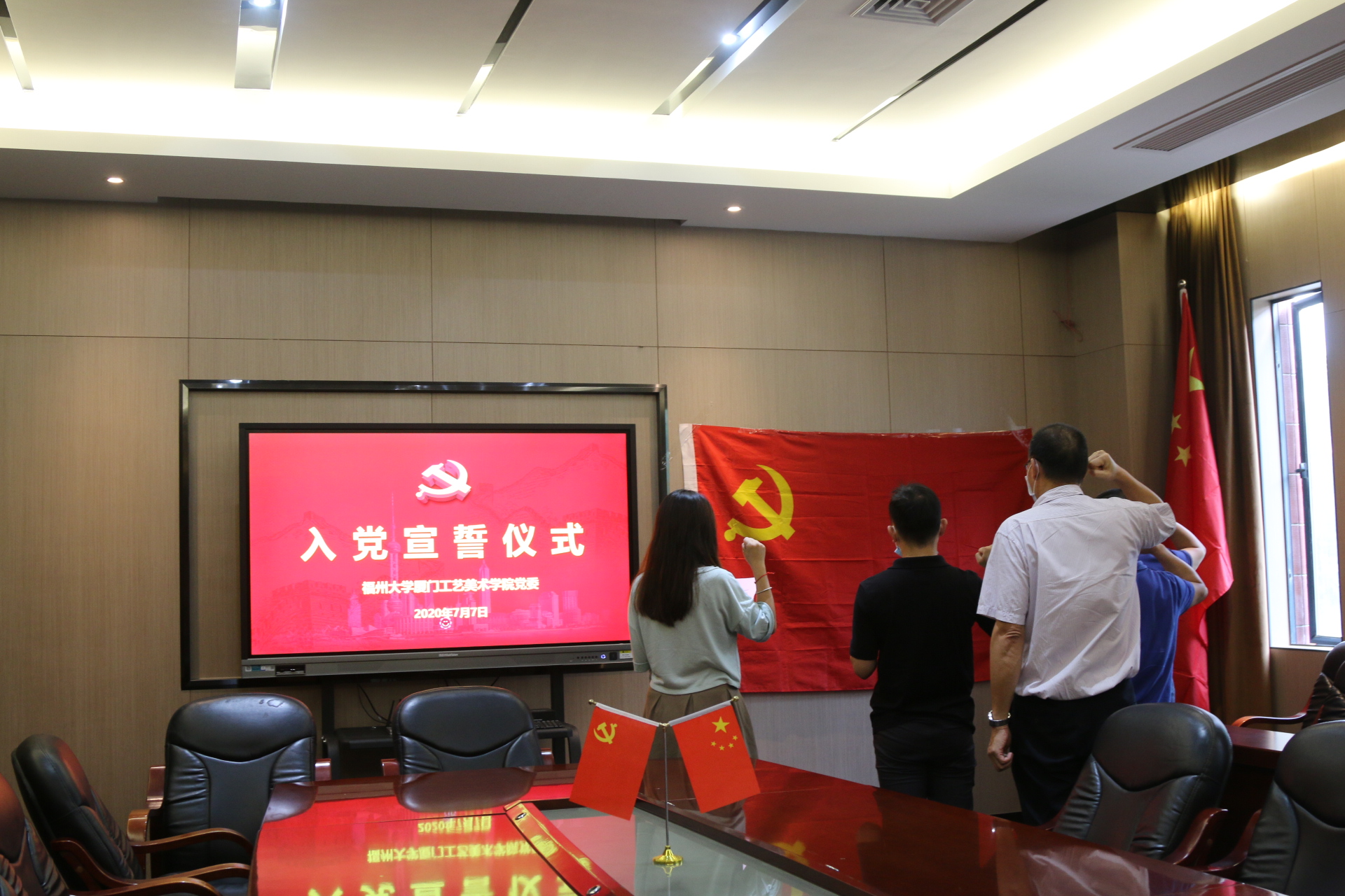 7月7日上午,学院党委在公教2#107举行了庄严而隆重的入党宣誓仪式。学院党委书记黄阿火,党办主任林瑞来以及新发展的3名教工党员参加了宣誓仪式。学院党委书记黄阿火作为领誓人带领肉漫 3名教工新党员面对党旗庄严宣誓,老党员重温了入党誓词。