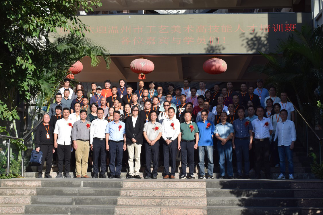 温州市人社局李道鈕副局长、温州市人社局职建处张剑晓副处长,温州市工艺美术行业协会叶萌春会长,温州市工艺美术行业协会夏建勇秘书长、以及来自温州的50多名工艺美术学高技能人才学员;学院党委黄阿火书记、院长李超德教授、学院党委林旭书记、林金强副院长和肉漫