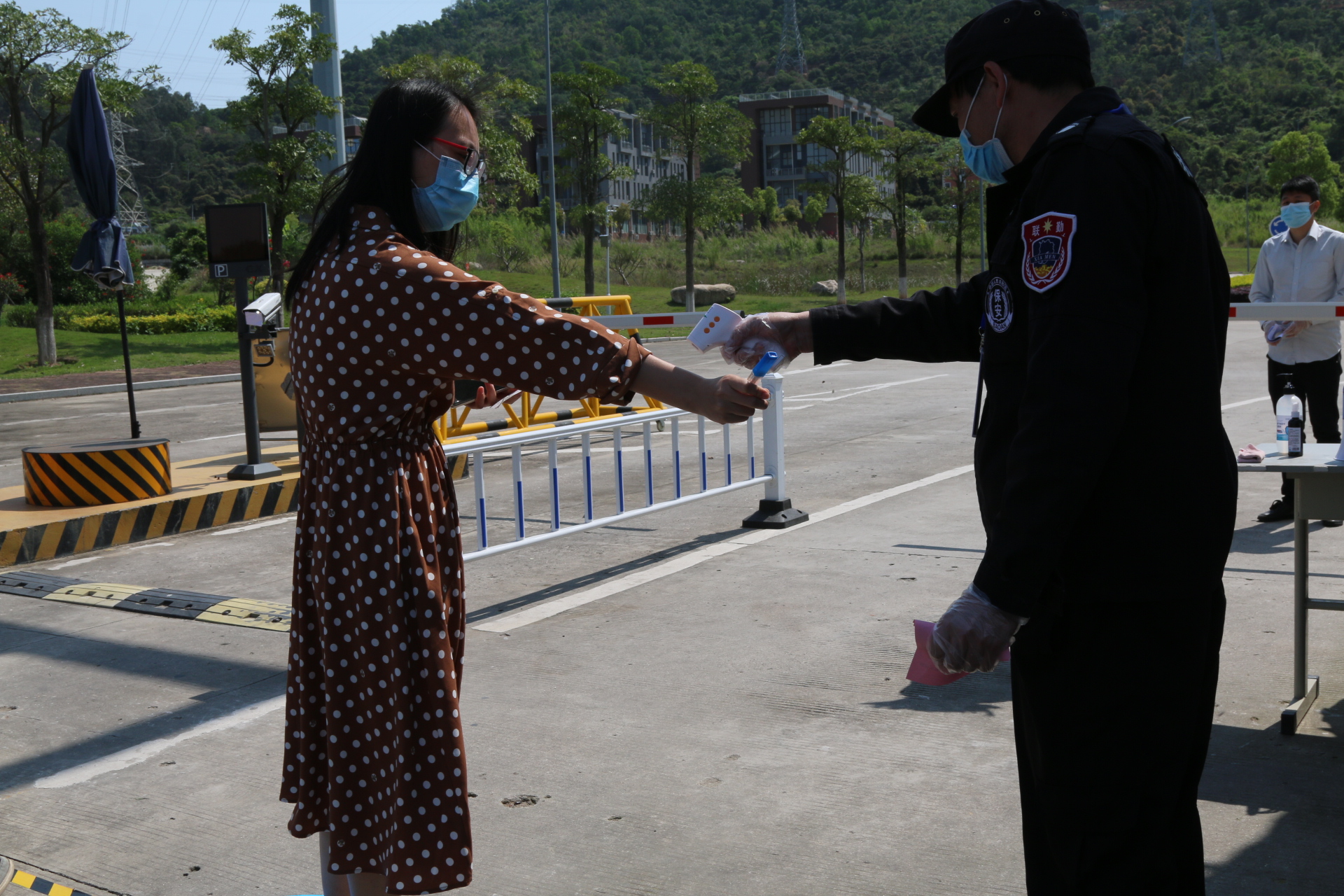 校门口保安测量体温,体温正常的学生手消毒后通过指定的通道迅速进入校园。