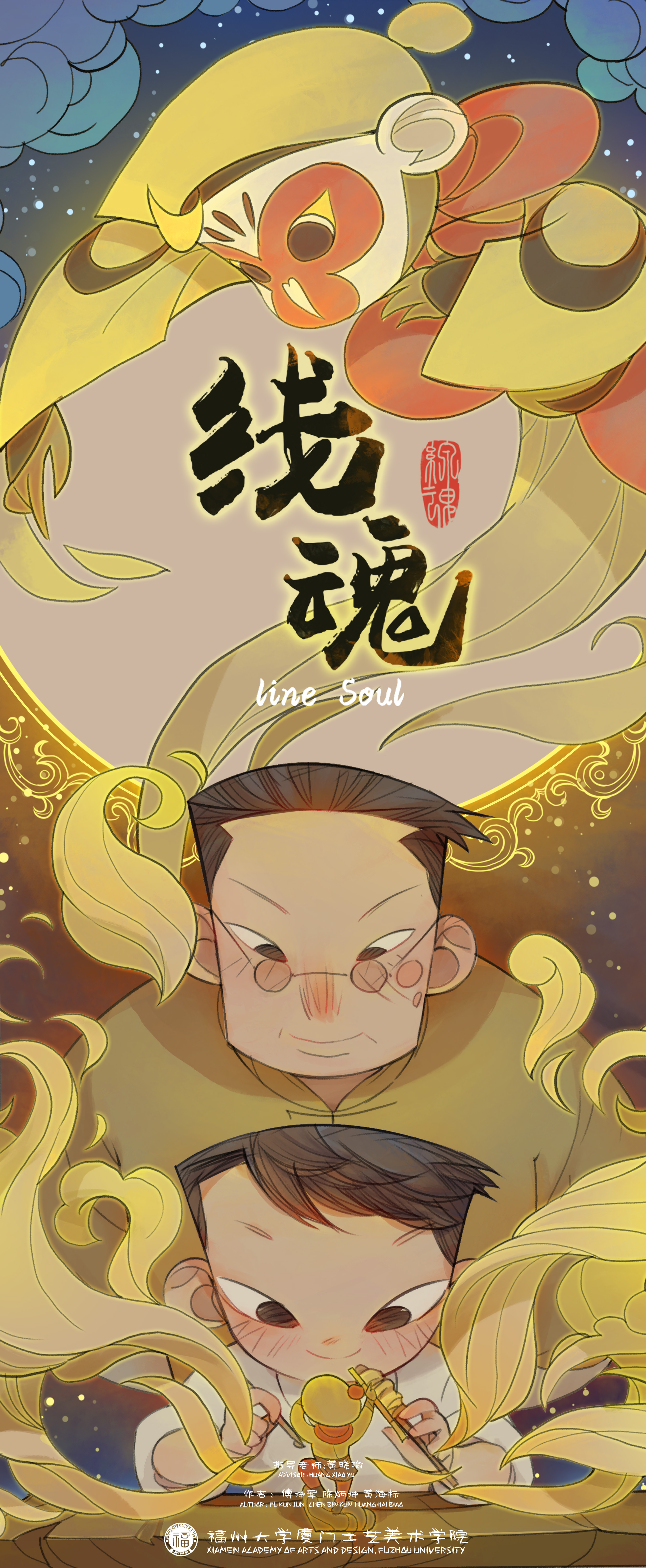 数字媒体艺术系黄晓瑜老师指导,傅坤军、陈炳坤、黄海标同学创作的动画《线魂》获得一类优秀作品奖及10万元扶持金。由肉漫