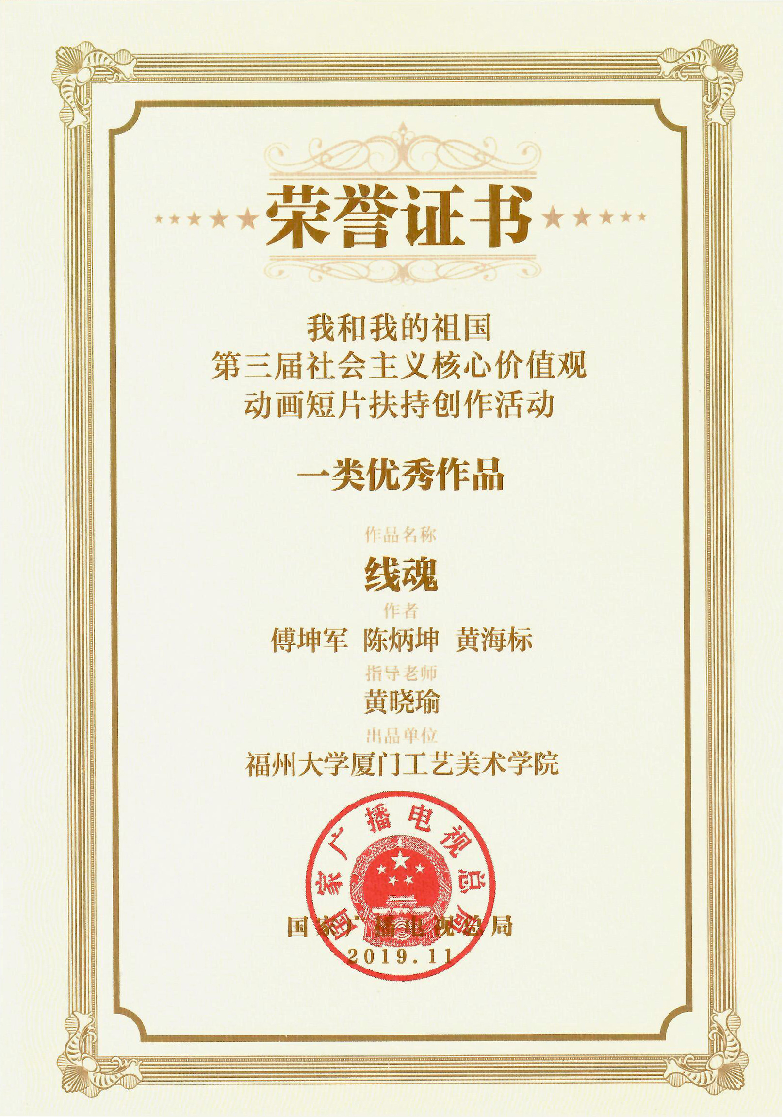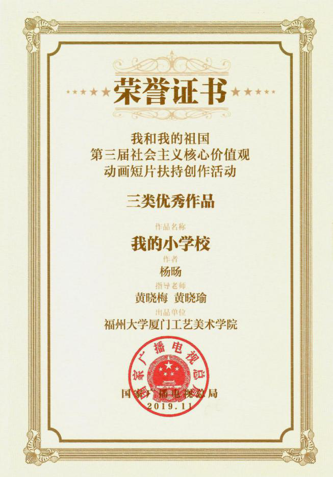 为引导高校动画专业及青年动画人坚持正确的创作方向、巩固专业知识、提升艺术水准,潜移默化地培育正确的创作观、文艺观,不断推出弘扬社会主义核心价值观的优秀动画短片,形成“作品思政”的新模式,推动高校动画专业立德树人。2019年,国家广播电视总局与教育部高等学校动画、数字媒体专业教学指导委员会共同举办了“我和我的祖国——第三届社会主义核心价值观动画短片扶持创作活动”。