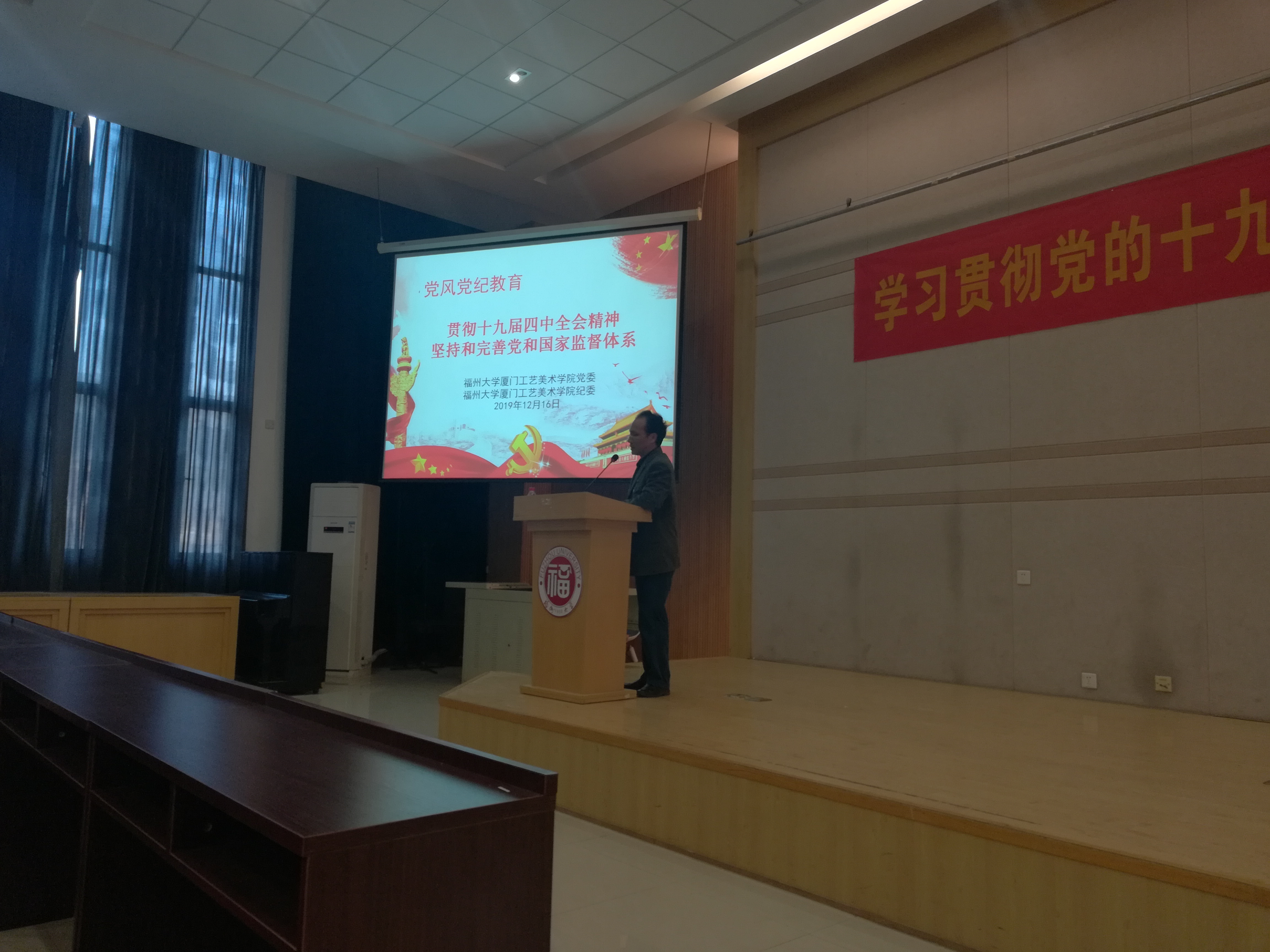 2019年12月16日下午,学院党委、学院纪委组织召开党员党风党纪教育学习会,全院师生党员200多名参加。学院纪委张华华书记在会上指出:党员要贯彻十九届四中全会精神,对坚持和完善党和国家监督体系作出如下解读:第一,这是我们党在长期执政条件下推进自我革命的重要制度保障;第二,坚持巩固党的十八大以来加强党和国家监督的制度成果;第三,完善党和国家监督体系。同时要求各党支部组织党员观看短视频《初心归来》、《记得》,并关注微信公众号“福建纪检监察”,全院师生党员300多名关注。