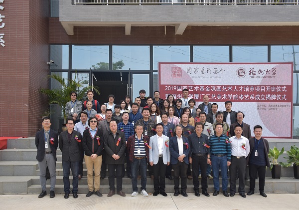开班仪式后嘉宾代表为漆艺系揭牌,仪式后,全体领导嘉宾学员在漆艺楼前合影留念。
