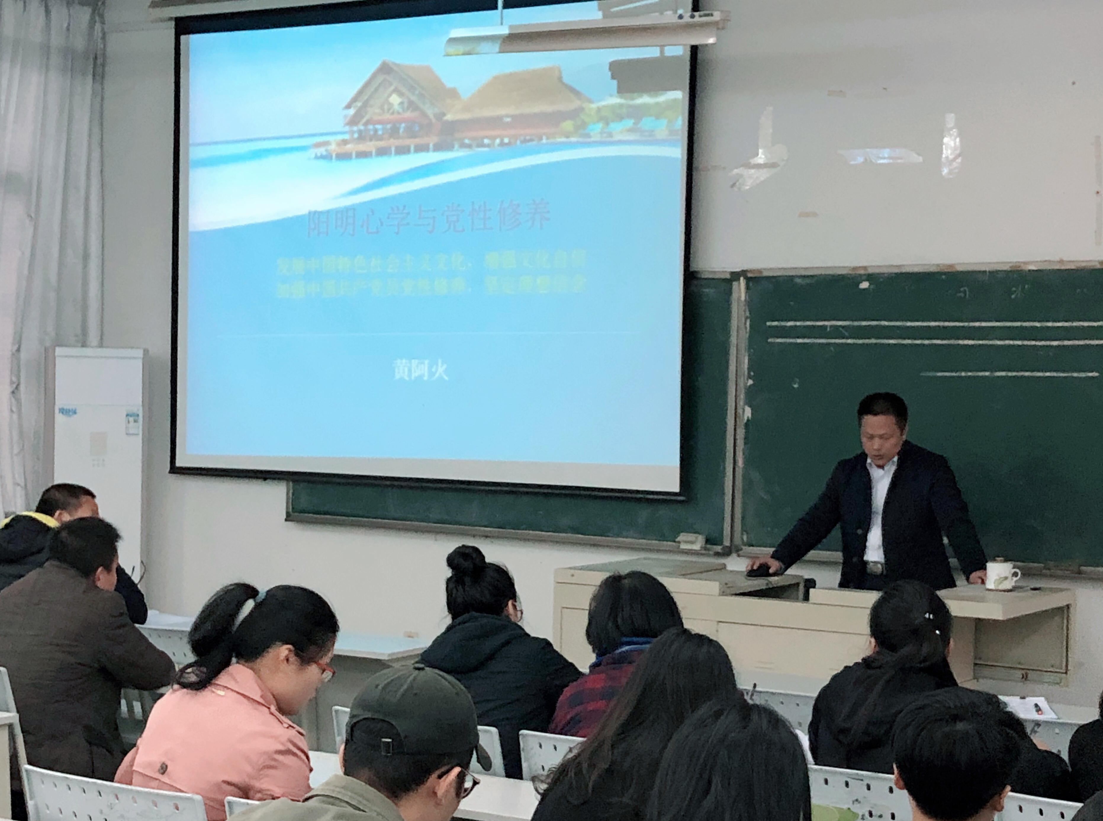 12月13日下午,学院党委书记黄阿火为所联系的几个支部党员上了一堂题为《阳明心学与党性修养》的专题党课。