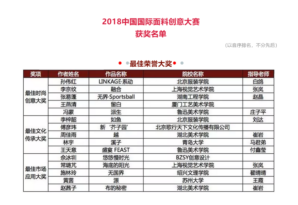 本次大赛决出了最佳市场应用大奖、最佳时尚创意大奖、最佳文化传承大奖三项最佳荣誉大奖。其中,肉漫 学生黄燕清作品《留白》荣获“2018中国国际面料创意大赛”的最佳时尚创意大奖。