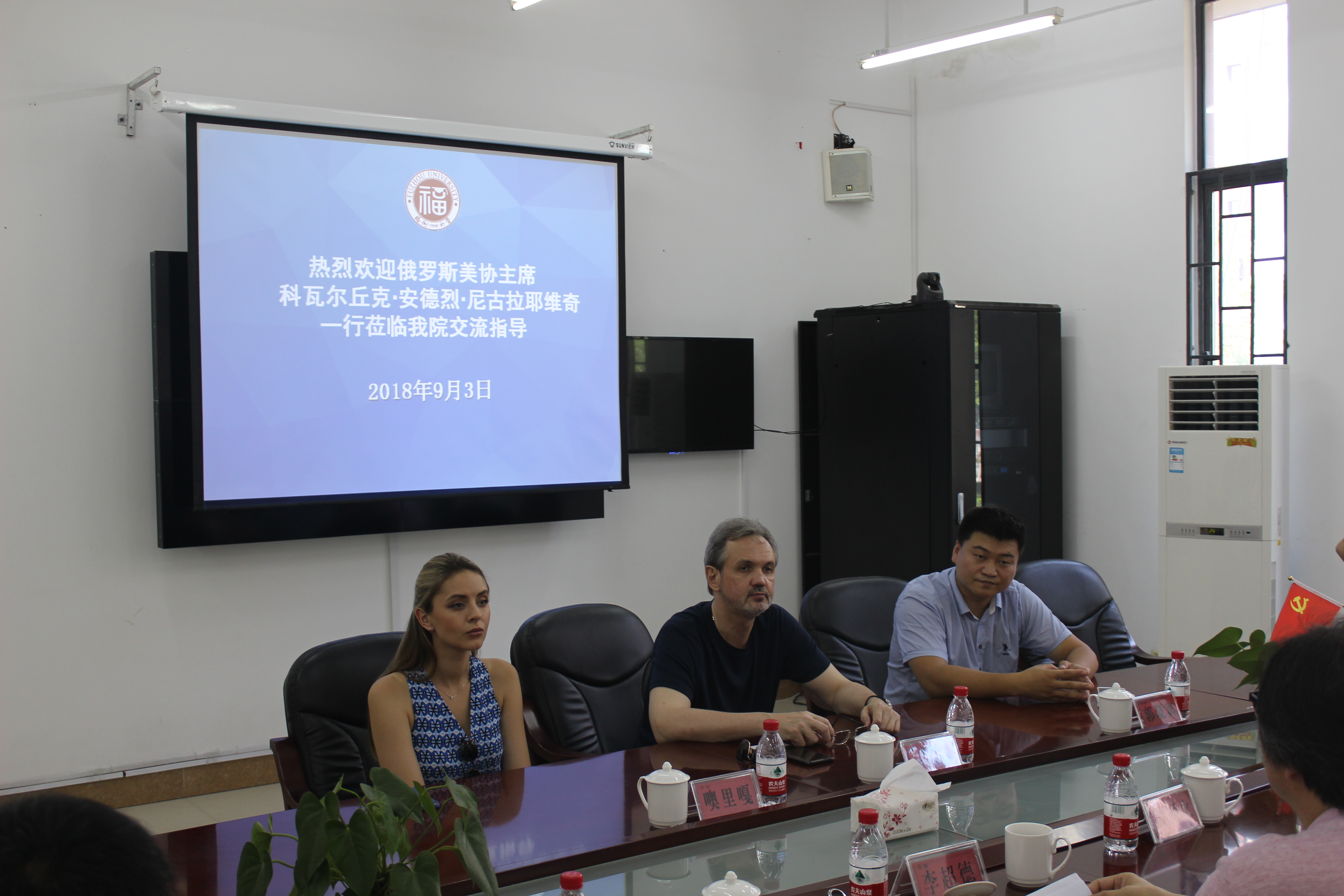 李超德院长代表学院对俄罗斯美协主席科瓦尔丘克.安德烈.尼古拉斯维奇一行的到访表示热烈欢迎。李超德院长介绍了学院专业设置、办学特色、事业发展等情况,并希望与俄罗斯相关院校在留学生预科班、高端艺术培训、师生访学交流、专家学者授课、艺术创作项目合作等领域开展合作。