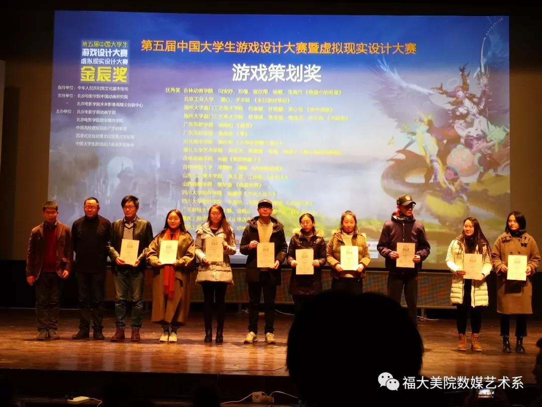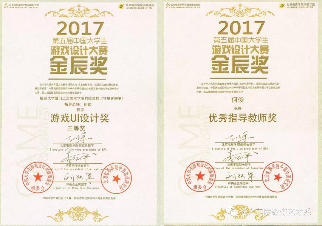 数字媒体艺术系2016级的虞珩艺、高杉、朱玥轲、郭依婷同学完成的《阿曼什》获得游戏策划二等奖。2016级的何张颖、许雅娜、张心羽同学完成的《林中城堡》获得游戏策划优秀奖。2016级的陈翠琳、陈奕坚、黄珠芳、李文琦同学完成的《天选者》获得游戏策划优秀奖。2013级的陈奇、郭文建、阮璟昱的毕业作品《守望者塔罗》获得游戏UI设计三等奖,何俊获得优秀指导教师奖。