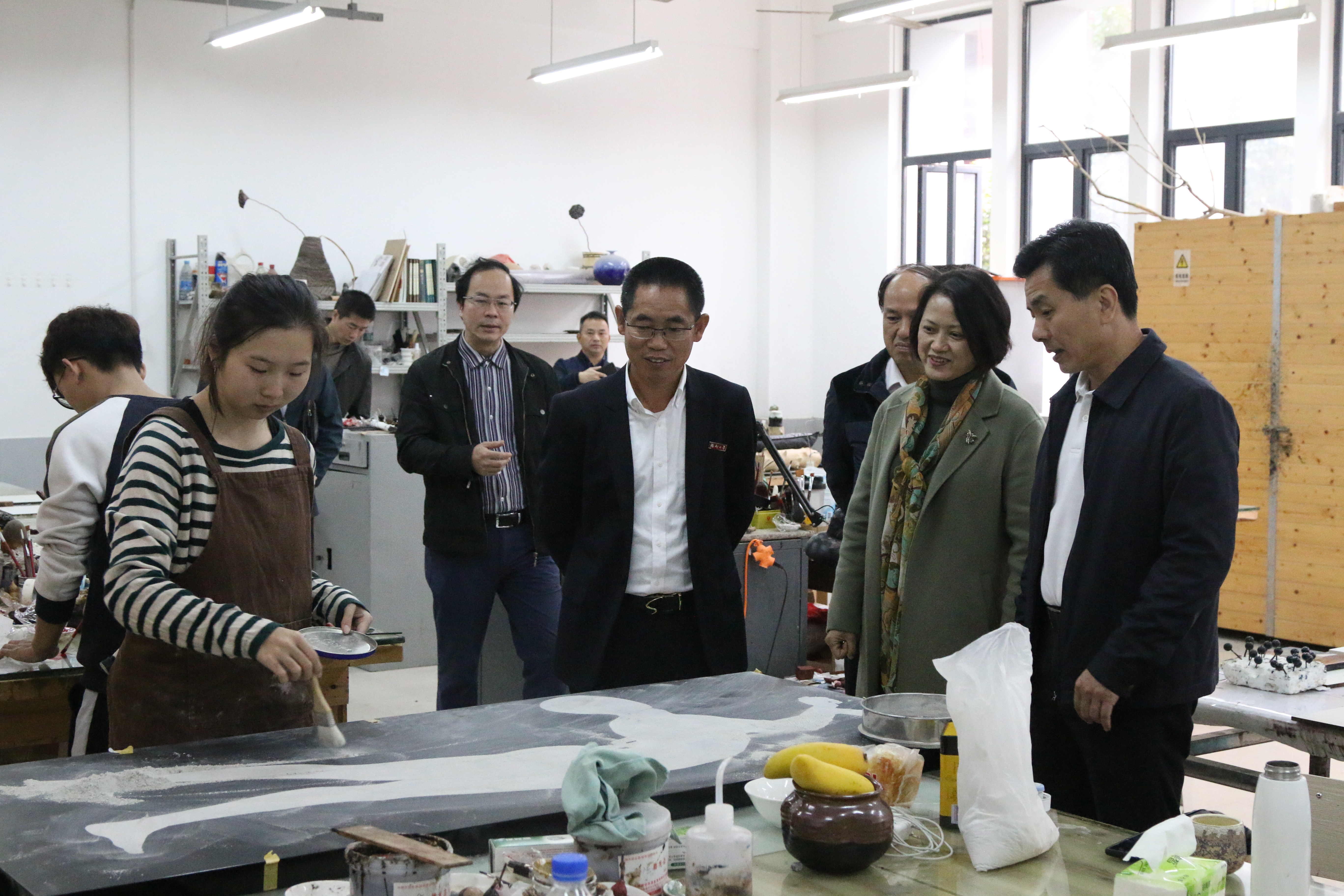 指导工作。在学院党委林文泰书记、吴绍兰副院长等学院领导的陪同下,何区长一行参观了学院美术馆、工艺美术系展厅、漆艺楼和4号教学楼工业设计体验区以及校园景观,并走入工艺美术系的教室与学生交流。何区长一行边参观边听取学院领导的汇报,他对学院的校园建设取得的可喜变化给予积极的评价和高度赞扬,对学院的教学成果给予充分的肯定。他希望学院能充分发挥艺术院校的特长,通过各种艺术表现形式宣传集美,弘扬陈嘉庚精神,何区长也表示区政府会持续关注支持学院的建设发展。林文泰书记代表学院领导对集美区政府长期以来给予学院的关心和支持表示感谢,并表示一定会发挥学院的优势,把校园打造成集人才培养、艺术展示、交流创新为一体的,富有人文与艺术的重要基地,支撑并引领集美文化创意设计产业的发展,成为集美区和厦门市的一张新名片。