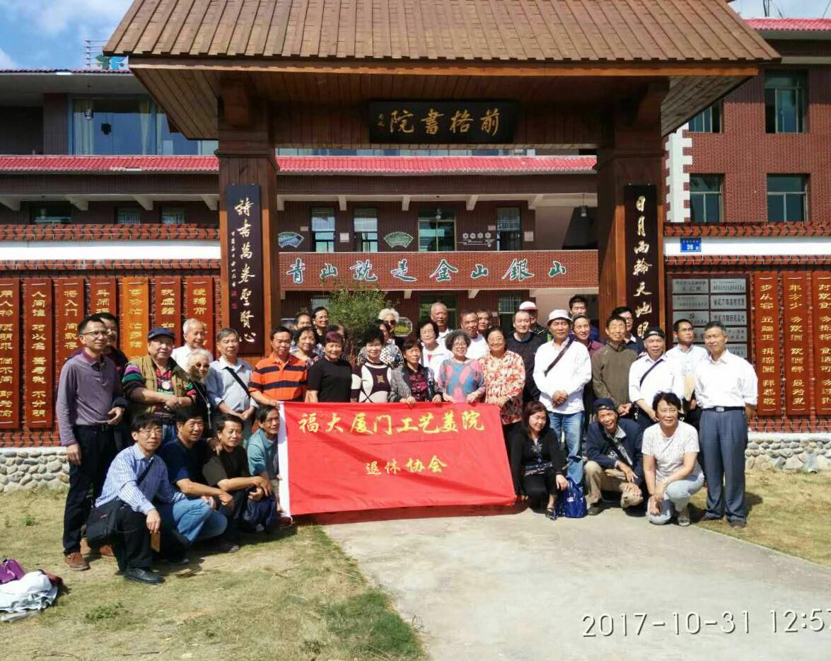 2017年10月31日,学院退协一行40多人前往美丽乡村—同安区汀溪镇前格村参观。汀溪镇前格村是同安区正着力进行建设的“五大发展示范村”。学院发挥专业和艺术人才优势,积极参与“美丽厦门,共同缔造”建设,在前格村古厝改造、党群服务中心设计施工和环境艺术提升等做了一定的贡献。优美的生态环境、整洁干净的乡村院落和村道,富有艺术设计感的党群服务中心和旧房墙面地图等,给老同志们留下了深刻而美好的印象。