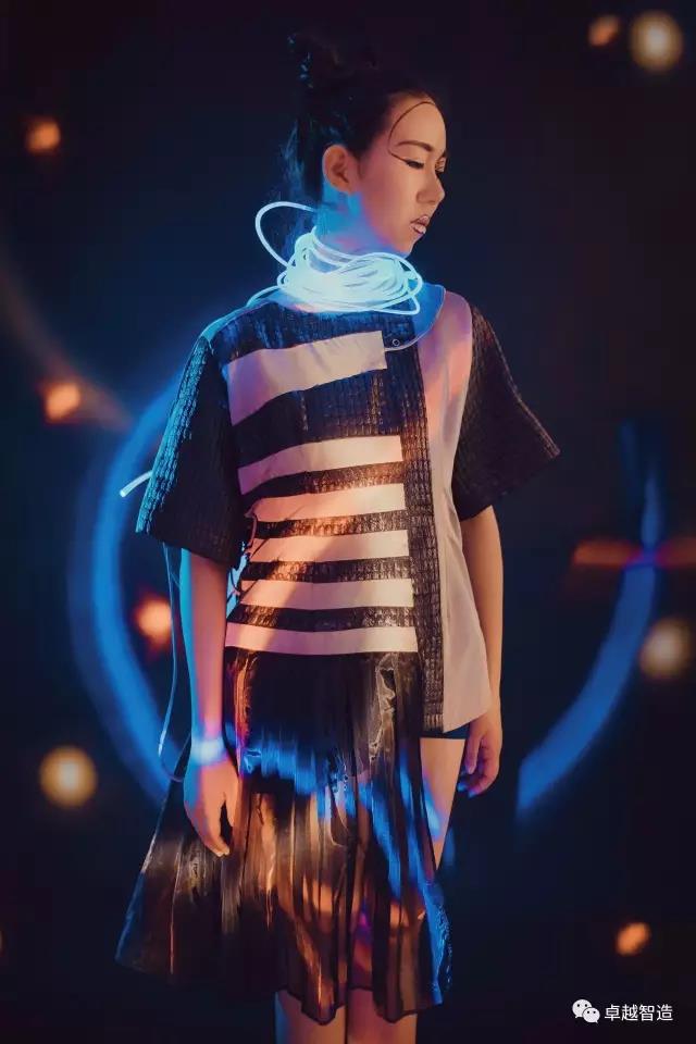 冷玥的毕业设计作品,创作理念是用户可以通过此款服装来进行弹奏创作,并在弹奏的过程中身体会不自觉的随着音乐律动,沉浸在奇妙的音乐和舞步之中,仿佛用户自己就是演奏家就是舞蹈家。该作品拥有许多巧妙的设计细节,是一款交互装置服饰,当用户触碰任意一片浅色布料就会发出相应的声音,用户可以穿着衣服即兴弹奏和创作,当用户摸碰布料发声的同时每一块布料有对应的灯条,灯条会在用户触碰时发光,离开即停止,这会增加用户在弹奏时侯酷炫的氛围。