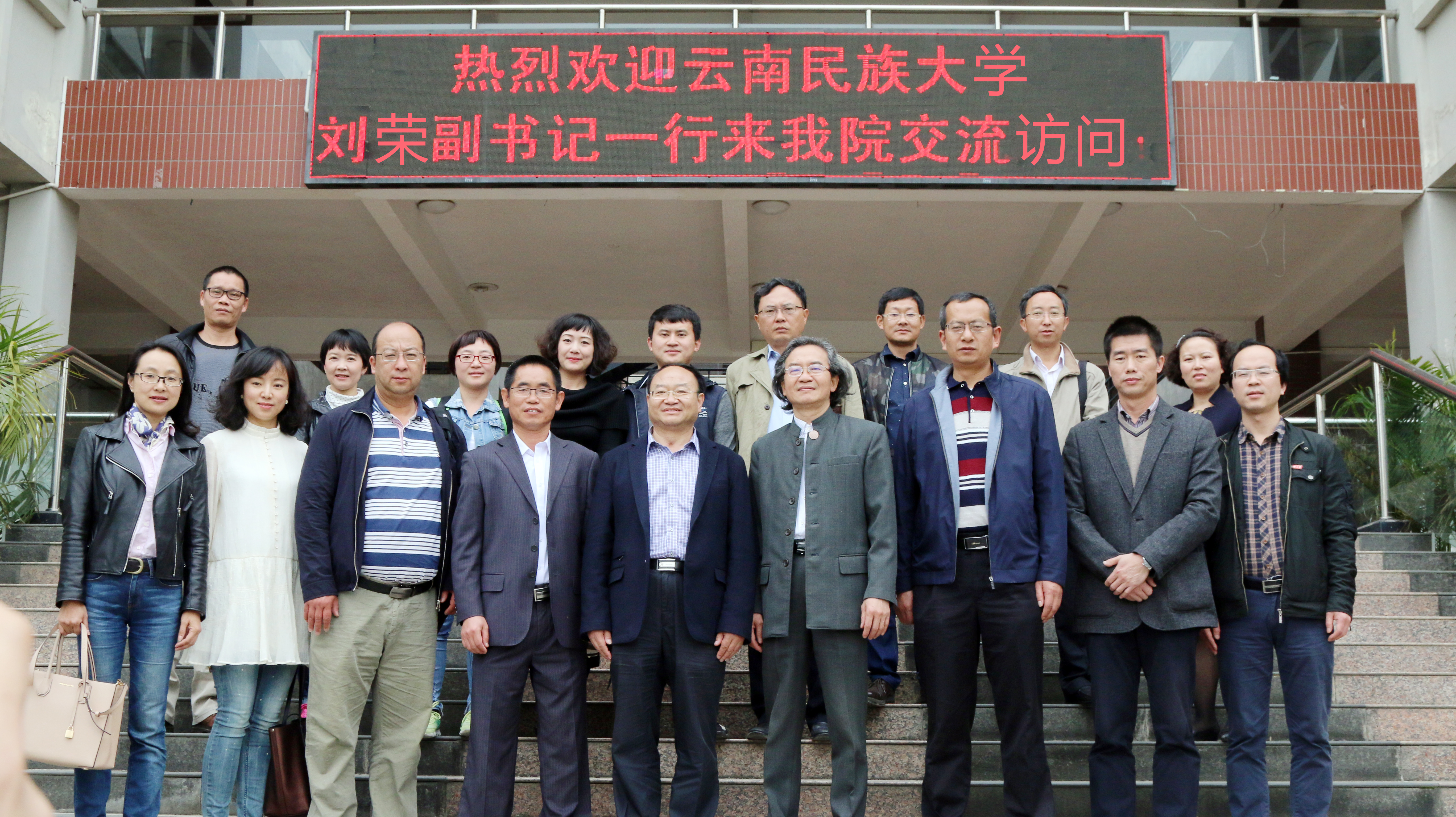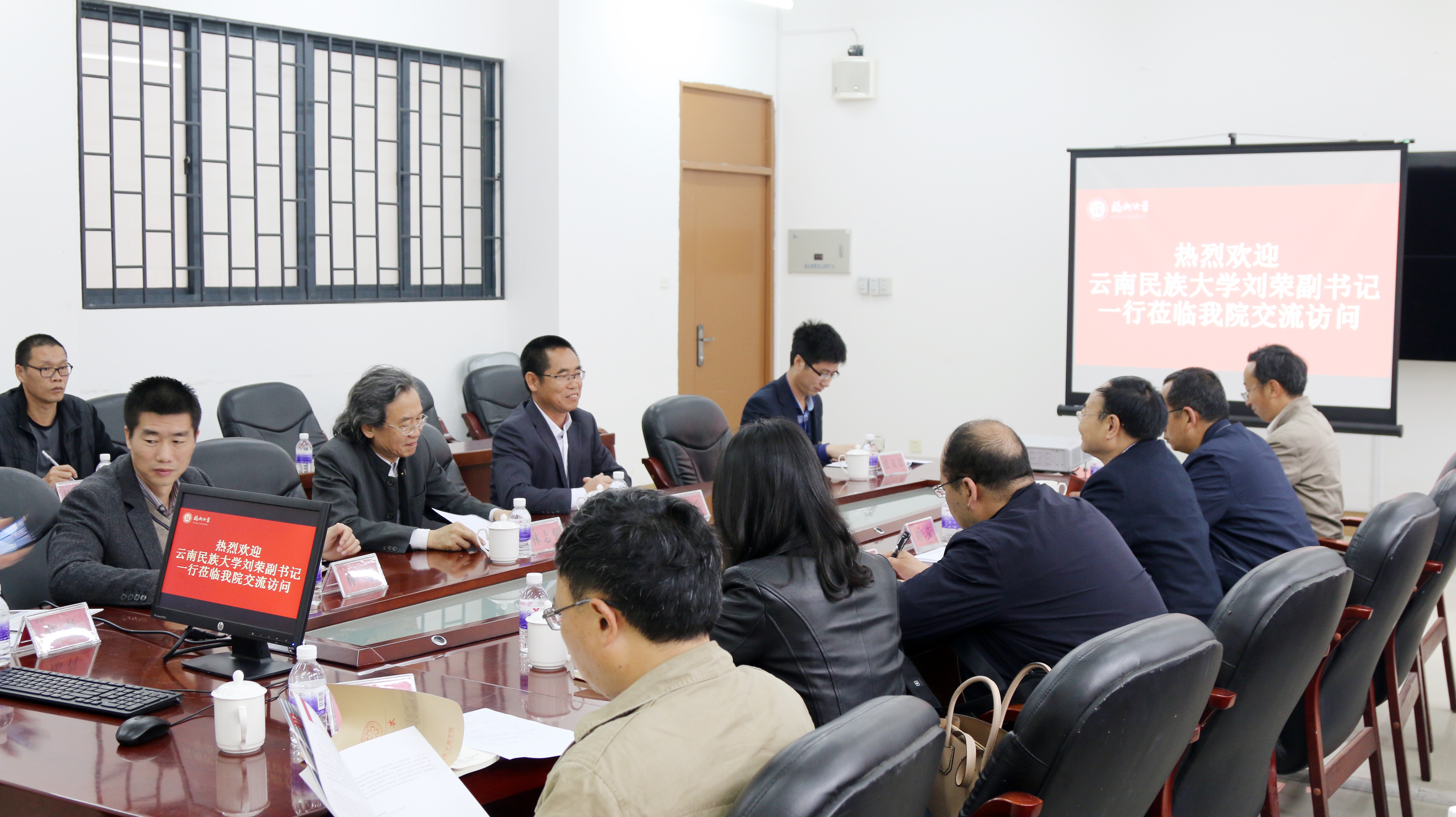 3月21日,云南民族大学刘荣副书记、艺术学院党委书记郝金文一行共15人莅临肉漫 交流访问。 21日上午,学院党委林文泰书记在会议室热情会见了来访客人,林志强院长致辞欢迎,双方简介办学情况后,共同商谈了合作办学事宜。21日下午,相关职能部门、专业系负责人参加交流,双方就文化创意产学研合作、艺术类专业建设与人才培养、实训室建设等方面进行分组交流学习。