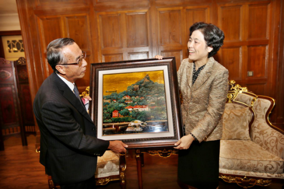 常务副院长佘国华教授的漆画作品《晃岩神韵》赠予苅谷勇雅。考察期间,苅谷勇雅应鼓浪屿管委会邀约,来到位于原英国领事馆的“漆艺大师”工作室,参观了漆画作品和漆画创作过程。