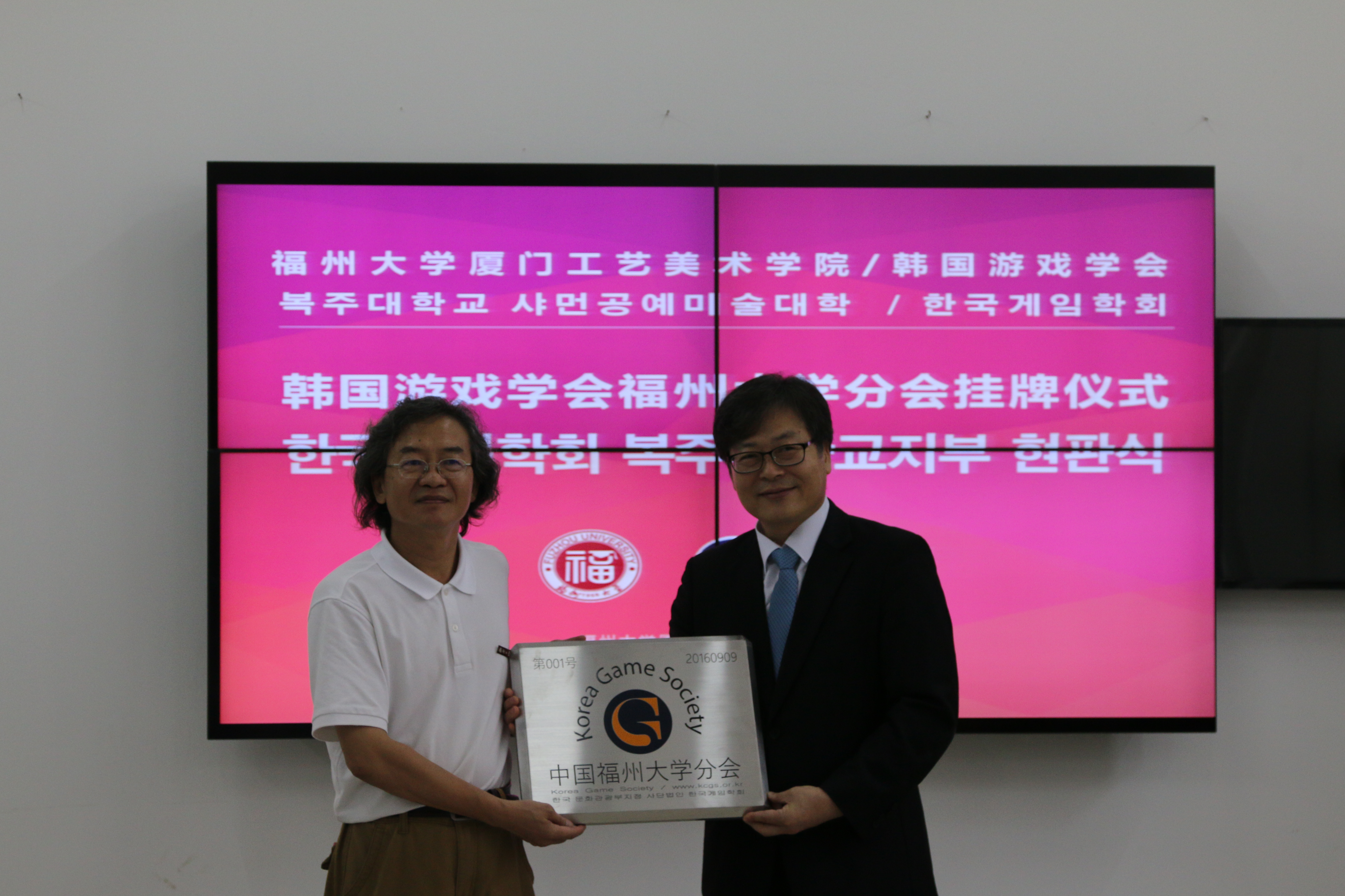 院长林志强教授共同为分会揭牌。李在洪教授表示,韩国游戏学会作为一个韩国国家级的学术研究机构,首次在海外成立分会,推动了东亚游戏设计专业学术研究的发展,借此平台,希望促进中韩两国在游戏设计专业上的学术交流与合作。仪式上,韩国游戏学会副会长景炳杓教授宣读了委任书,任命肉漫