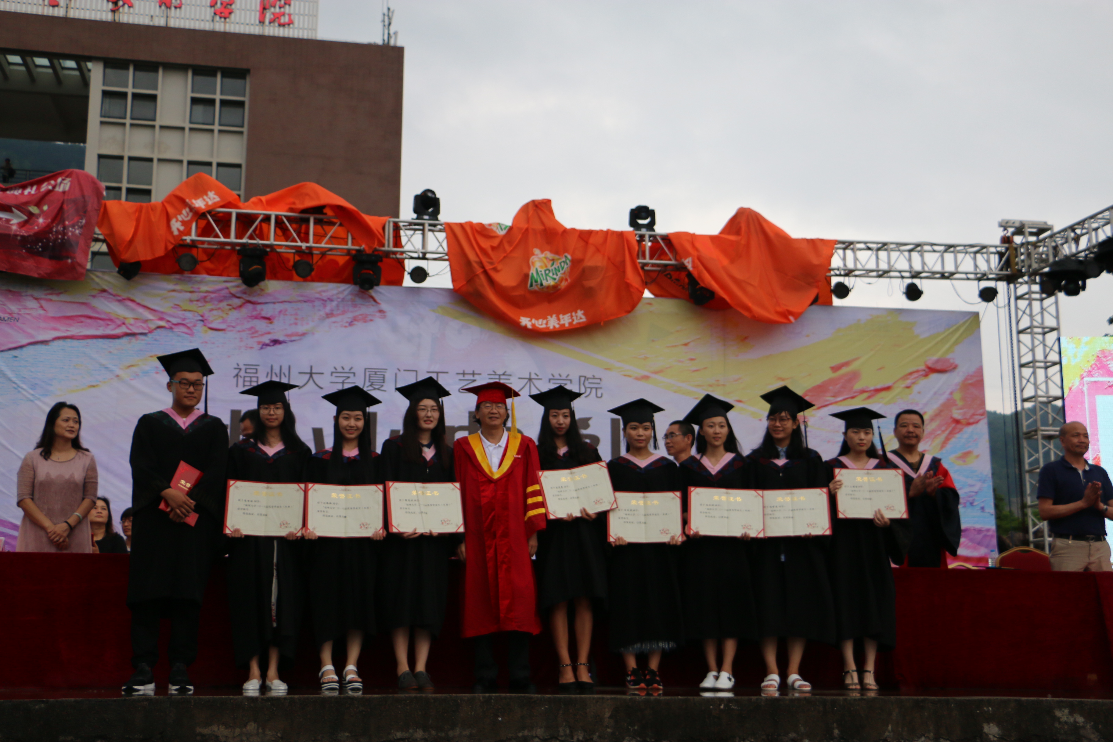 宣读完毕,各系导师为毕业生扶正流苏,学院领导为毕业生颁发学位证书,林志强院长为毕业生代表一一正冠拨穗,优秀毕业设计收藏作品的作者代表以及2016届校友联络员和校友召集人也上台接受了颁奖。
