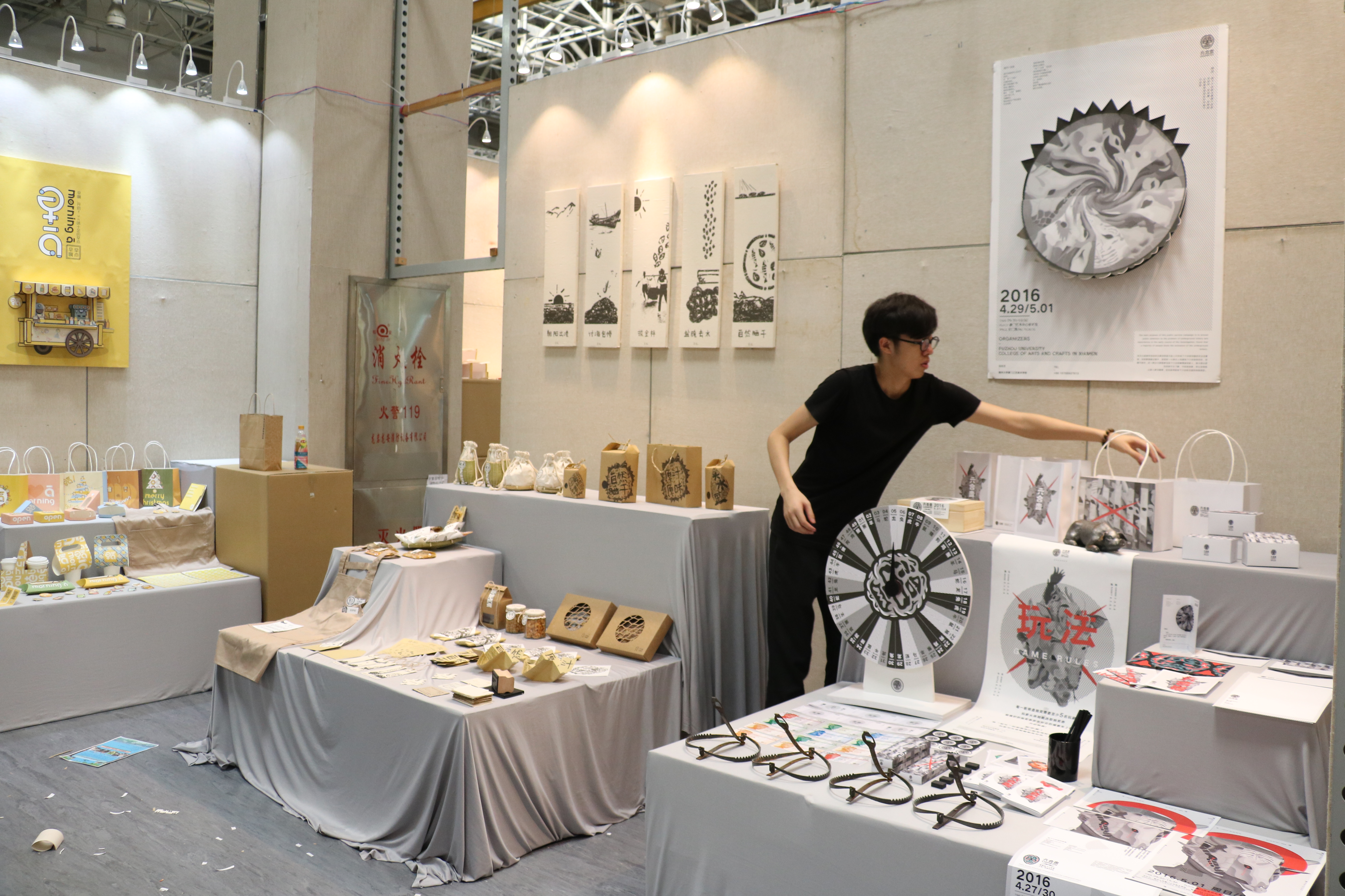 2016届视觉传达设计、环境设计、服装与服饰设计、数字媒体艺术、漆画、中国画、油画、雕塑等10余个专业,近450名学生的毕业作品,28日上午在厦门市文化艺术中心美术馆一楼紧张而有序的布展中,各专业指导老师和工作人员到现场对学生布展工作进行指导。一年一度的毕业设计展,是肉漫
