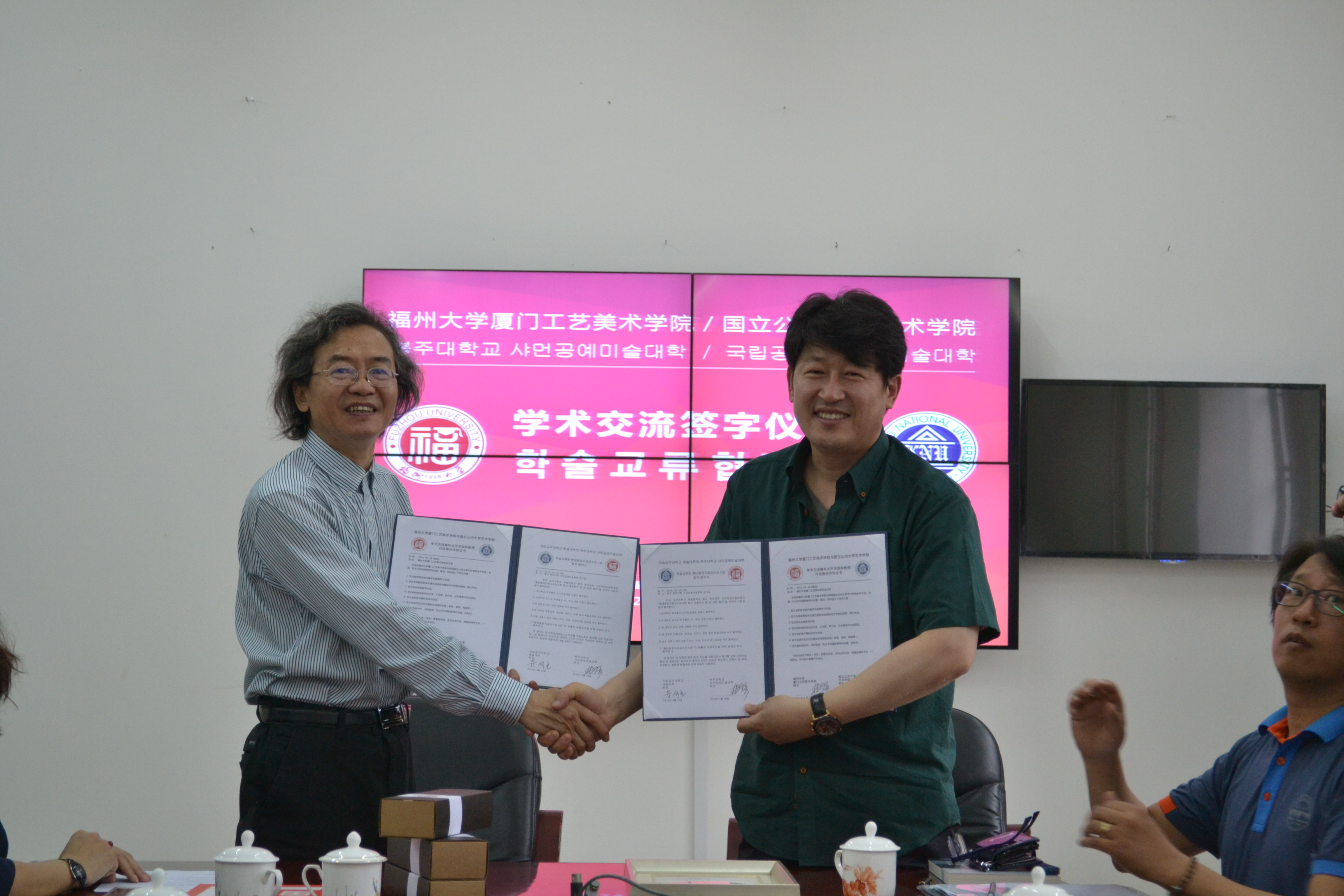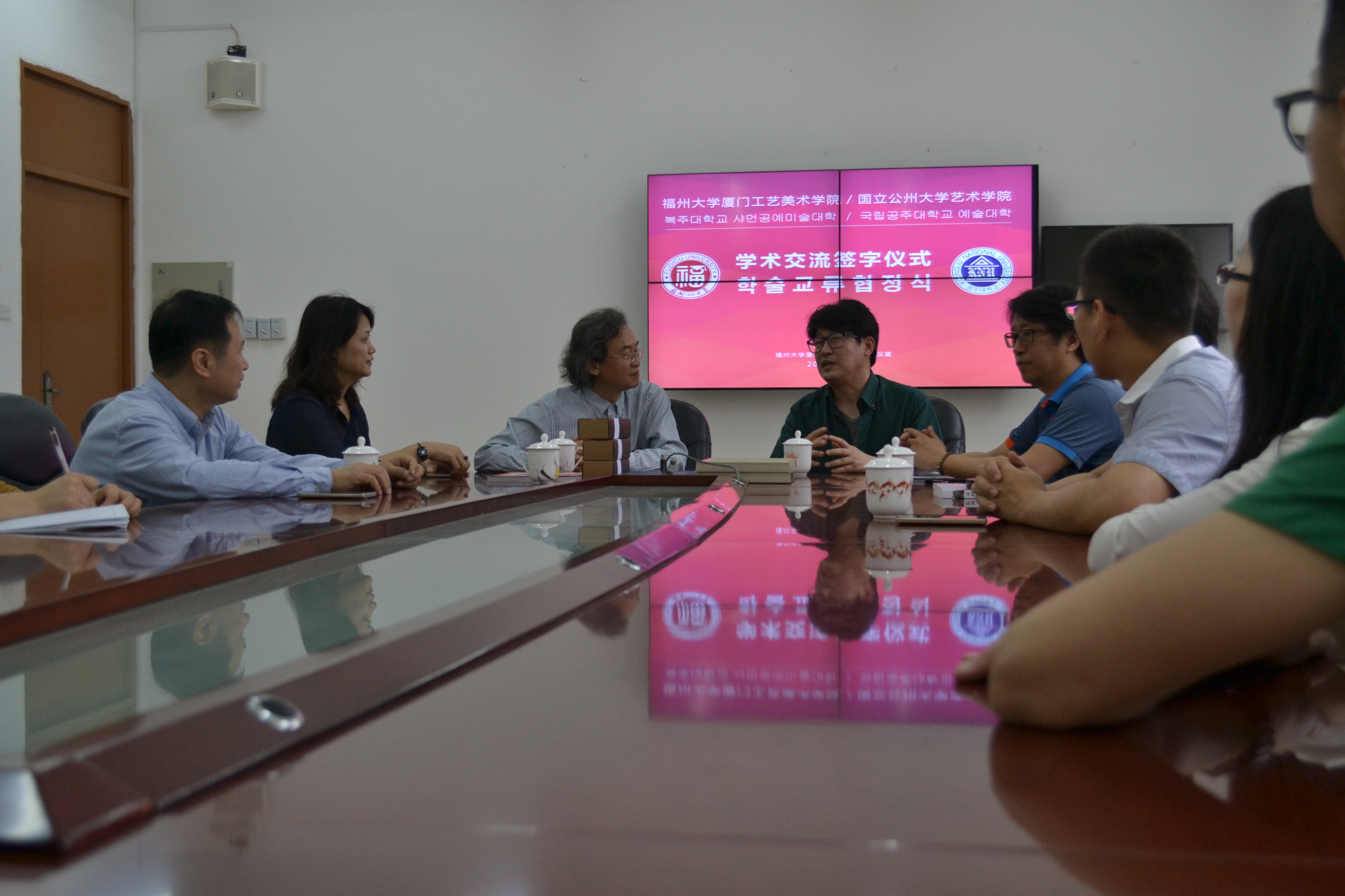 4月28日,韩国国立公州大学艺术学院院长柳锡昊教授一行到肉漫 考察交流,与肉漫 院长林志强教授、副院长吴绍兰教授以及发规办、数媒系相关负责同志在107会议室召开了座谈会,就有关艺术教育,师生访学交流、科研合作等问题进行了深入探讨;同时签订《学术交流暨环太平洋国际教授作品展合作协议》,进一步加强兄弟院校间的学术交流与合作。