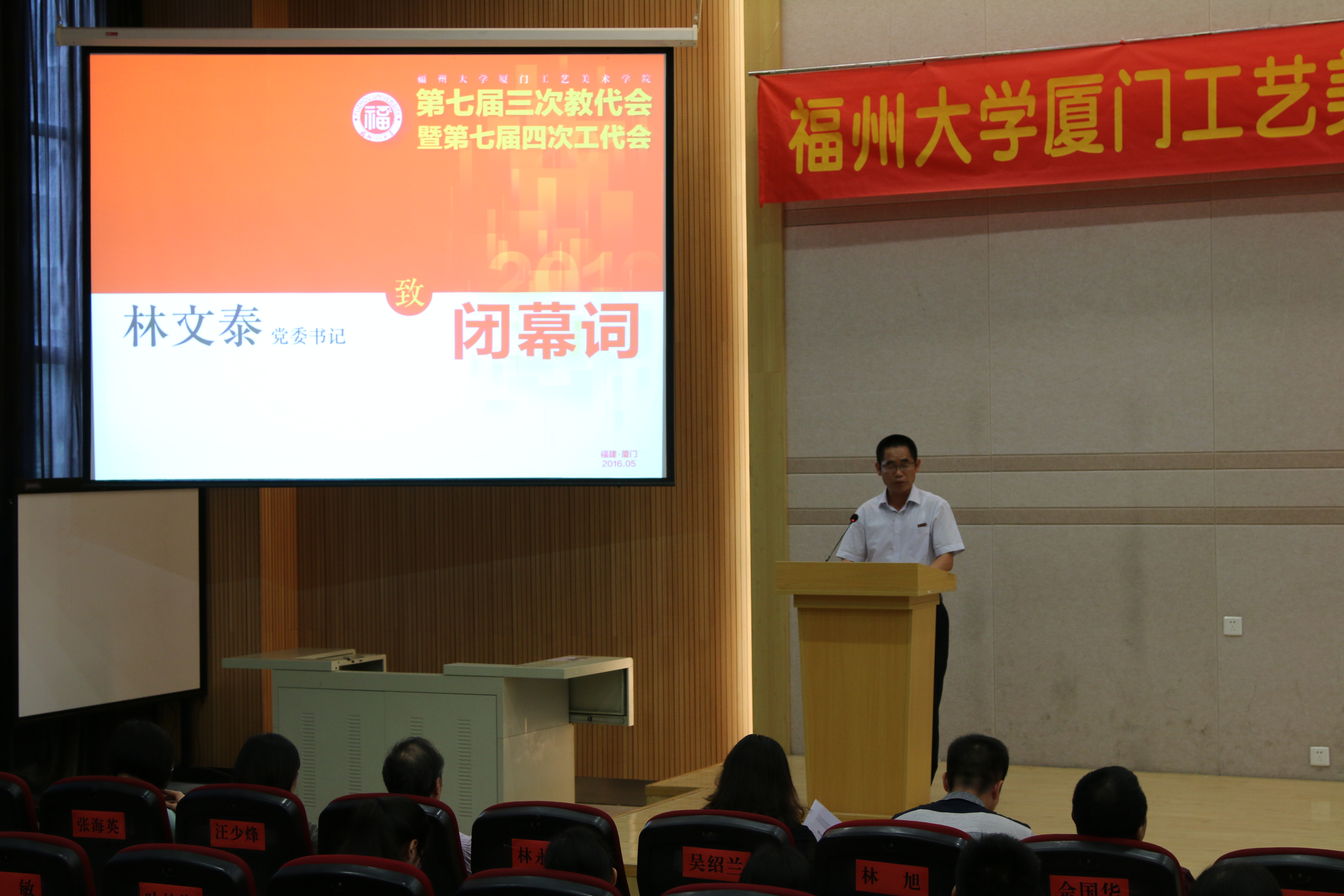 林书记指出,2016年是实施“十三五”规划的开局之年,也是学院发展的关键一年,这一年学院将在集美新校区建设、鼓浪屿校区的建设与改造、本科教学改革、学科建设、国际化交流等方面重点推进,希望每位代表充分发挥当家作主的首创精神,学习、传达好学校、学院“两代会”的精神,带领全院广大教职工艰苦奋斗,迎难而上,开拓创新。同时他就学院2016年的工作提出五点意见:一是紧紧围绕高水平大学建设和“十三五”规划,调动教职工投身学院改革发展的积极性;二是坚持以人为本,抓好队伍建设;三是高度重视人才培养;四是坚持改革创新,完善制度建设,提升办学活力;五是切实加强校园文化建设,推进师德师风建设。