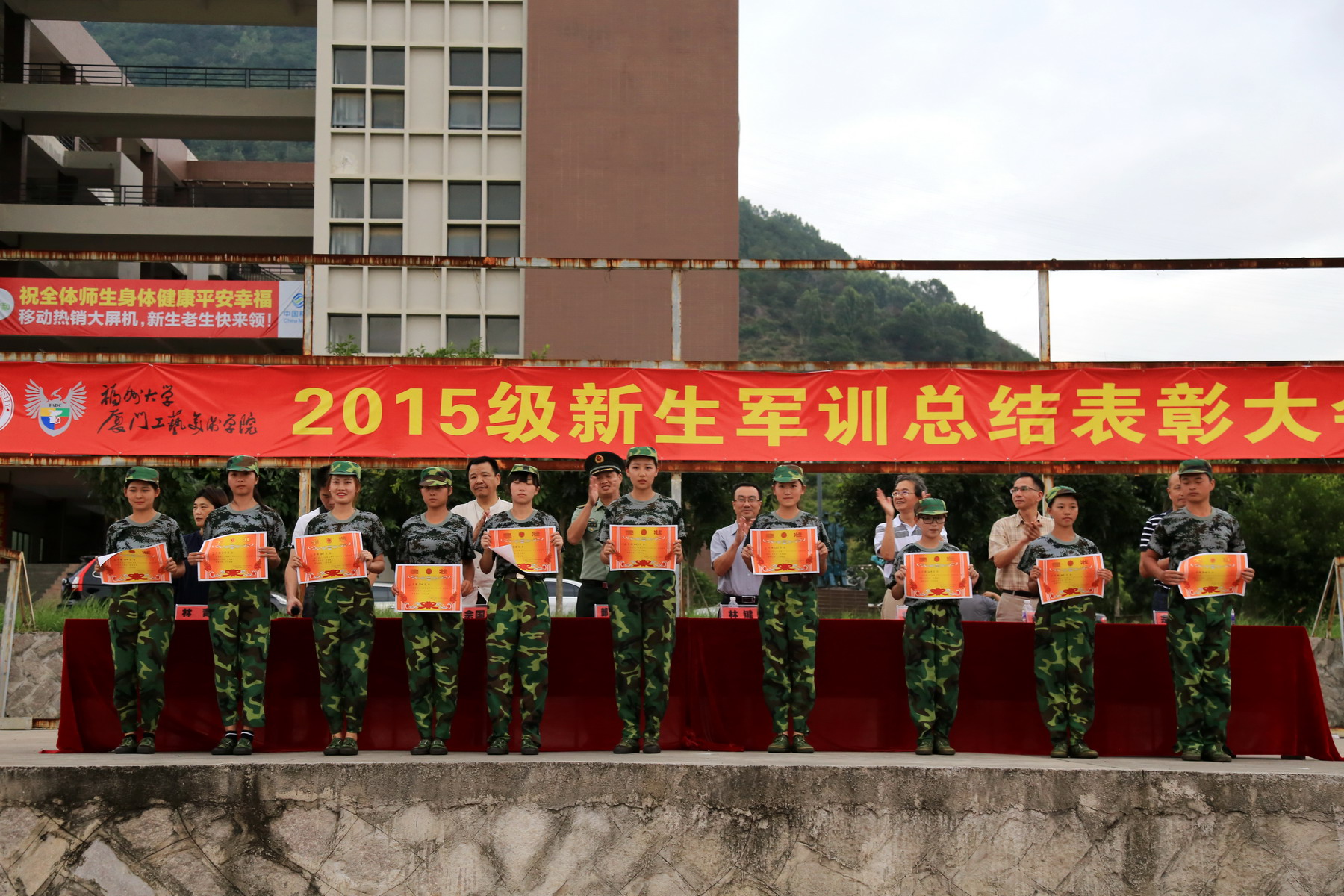 于学校操场举行了2015级新生军训总结表彰大会,学院730多名2015级新生以饱满的精神状态参与了大会。学院领导林键书记、林志强院长、佘国华常务副院长、郑顺利副书记、林旭副书记、佘国富副院长、工会主席林青老师及承训部队领导出席了大会。大会由学院党委林旭副书记主持。