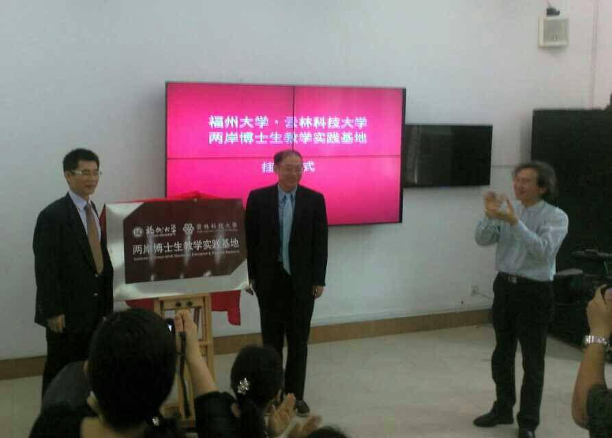 •云林科技大学两岸博士生教学实践基地”揭牌,并互换纪念品。仪式结束后,全体与会人员在教学楼前合影留念。