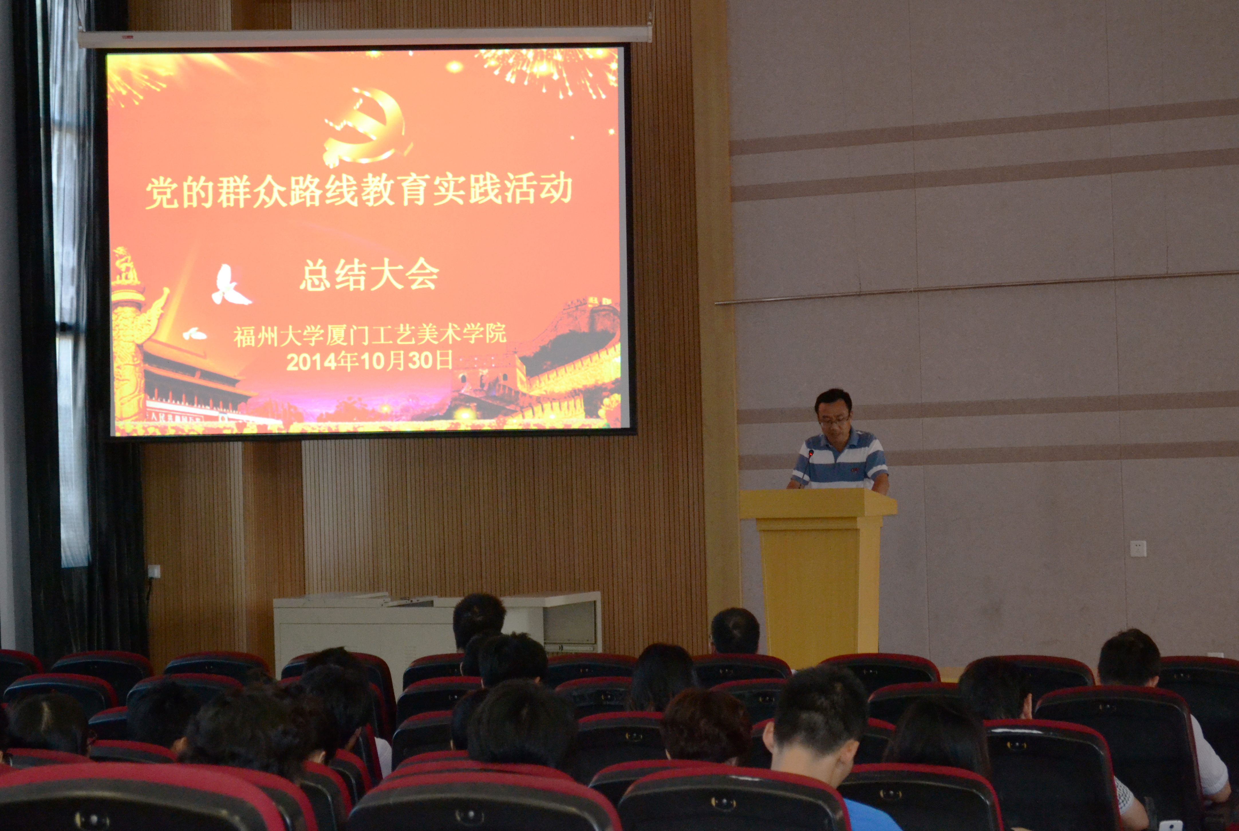 在集美校区2号教学楼311会议室,召开党的群众路线教育实践活动总结大会。院党委书记、院党的群众路线教育实践活动领导小组组长林键作了总结报告。院党政工领导,全体在职在岗教师党员,学生党支部书记、离退休党支部书记、各科、室、系、馆、基建办、实验中心负责人、民主党派教职工参加了大会。总结大会由学院党委郑顺利副书记主持。