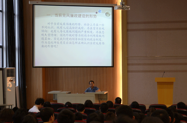 师生党员党风廉政形势教育》的报告。报告会由学院林键书记主持,学院全体教职工党员、各行政部门、系负责人、2014届毕业生党员、学院分党校第157期预备党员培训班学员共260人在311会议室参加了报告会。