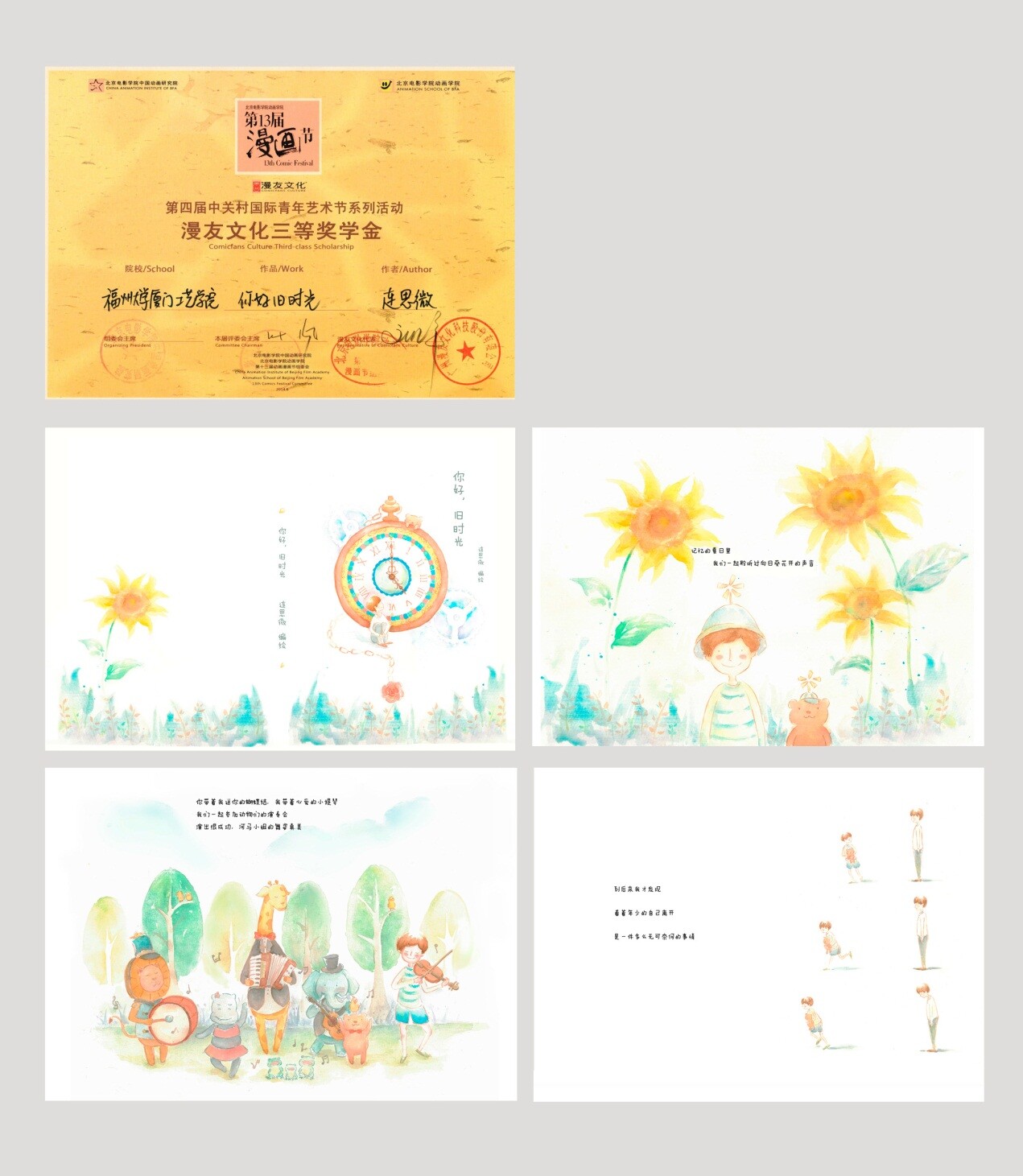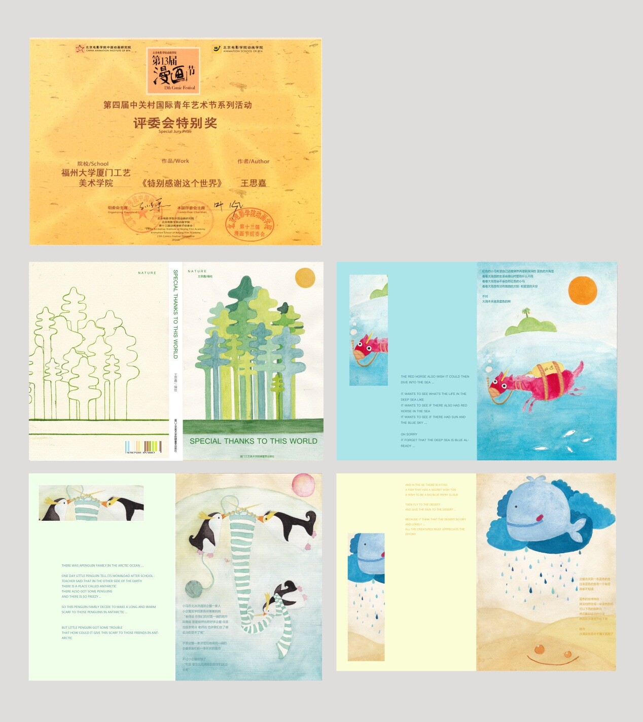 5月中旬,肉漫 数字媒体艺术系选送一批优秀学生漫画、绘本作品参加北京电影学院第13届漫画节。经过专业评委的多日严格评审,肉漫 数字媒体艺术系:11级学生王思嘉 绘本作品《特别感谢这个世界》获得 评委会特别奖;12级学生连思微绘本作品《你好,旧时光》获得漫友文化三等奖学金;11级学生曾小琴绘本作品《我叫卡卡》获得优秀作品奖 ;指导教师黄晓梅获得优秀指导教师奖。