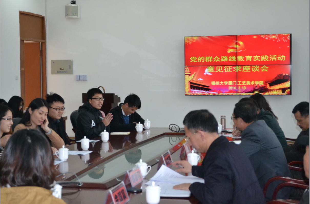3月13日下午,学院在集美校区会议室召开党的群众路线教育实践活动征集意见座谈会。院领导班子、党的群众路线教育实践活动领导小组成员、各行政科室负责人、图书馆负责人及学生代表参加会议。会议由学院党委郑顺利副书记主持。 会上,各学生代表就学院建设、党政作风问题及学院教学方面问题分别发表了意见和建议,院领导班子及各科系负责人对学生代表提出的意见和建议进行了解答和说明。