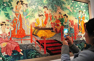 参观者在拍摄展出的磨漆画作品《新韵》