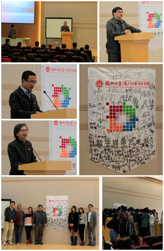 林志强院长宣布数字媒体艺术系成立,并以“年轻、朝气、未来”为主题发表了热情洋溢的讲话。林键书记宣布人事任命,任命林建德教授为数字媒体艺术系系主任,并对数字媒体艺术系提出殷切的期望、对系的成立表示热烈祝贺。林建德教授在播放数字媒体艺术系视频介绍后,接着向大会的嘉宾与师生简单说明数字媒体艺术系的学科方向并对参会嘉宾表示感谢。