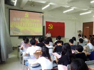 在集美校区公教208举行学生党员宣誓活动。学院党委林键书记出席活动并发表讲话。学院党委郑顺利副书记带领学生党员90多人共同面向党旗宣誓。学院党委委员、团委书记兼学生科科长陈振兴老师主持宣誓活动。