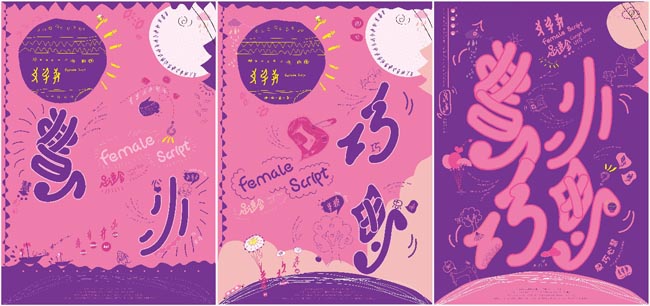 这个作品源于她们毕业设计课题《“女字卉”——湖南女书的现代化研究》。女书脱胎于 方块汉字,是世界上现存惟一的女性专用文字,已濒临灭绝。该项目希望研究旧时代女书独特的造型风格和符号语言,在湖南女书原始构字原理的基础上,进行重新 设计和编排,提升新女书识别度和易学度,传承和拓展女书的文化价值,赋予其新的职能。