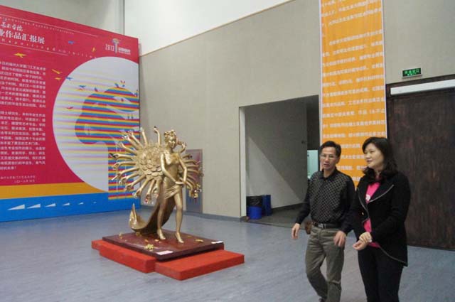 叶青副处长(右一)在郑顺利副书记(左一)的陪同下参观肉漫 毕业生作品汇报展