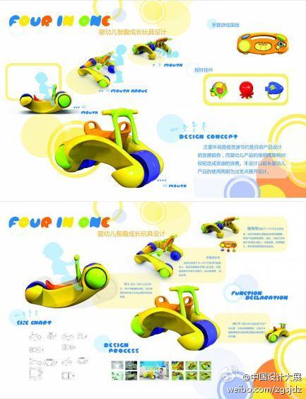 婴幼儿产品的使用周期短容易造成资源的浪费,此产品以延长婴幼儿产品使用生命周期为出发点展开。集健身架、手推学步车、摇马和滑行车四种功能于一体,可以灵活拆装变形,以满足儿童在不同年龄阶段体能锻炼与智力成长过程中多样需求。