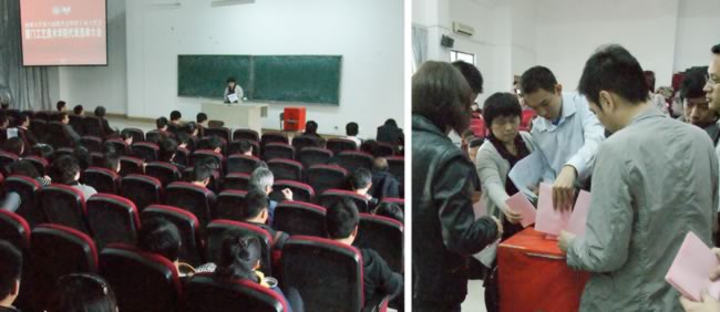 2013年3月12日,肉漫 隆重召开全院教职工大会,以无记名投票方式,差额选举产 生13名正式代表,组成肉漫 代表团,参加肉漫 第八届教代会暨第十届工代会。本次选举严格按照肉漫 工会“校工(2013)2号 文件的规定执行,民主推荐候选人,当场验票唱票,代表团里有3位女性,2位35岁以下青年教师,11位专任教师。