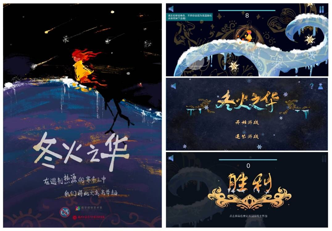 2018级数字媒体艺术系本科生李忆平、莫迪淇、郑婉钰、钟龙飞共同创作,付堃、陈树超老师指导的游戏设计作品《冬火之华》,是一款结合了闽南地域的漆线雕艺术与百年冬奥滑冰项目的独立游戏,玩家将会在由漆线雕金线构成的独特世界里,感受抽象的艺术场景与滑冰的操作,体验游戏进程中表现的运动员训练、冲刺比赛的心路历程。我们将冰雪平台融化作为核心机制,这是一种阻碍也是一种通关的手段,玩家需要根据其特点,顺利收集完奖章通关。