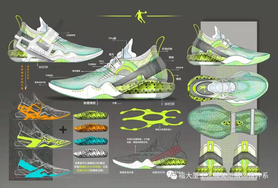 近日,在第十五届“乔丹杯”中国运动装备设计大赛中,肉漫 服装系服饰班李铎同学荣获运动鞋组金奖,徐兴文同学荣获运动鞋组银奖和网络人气奖,指导老师卢建军。“乔丹杯”中国运动装备设计大赛从2006年举办至今已进入第15个年头,本届比赛共收到来自国内知名设计院校、设计机构和独立设计师的539份作品。其中包括347份篮球服装效果图、192份篮球鞋效果图。经过评委们最终评选出篮球服装以及鞋类各20份优秀效果图后,选手们继续深化,参加决赛的角逐。