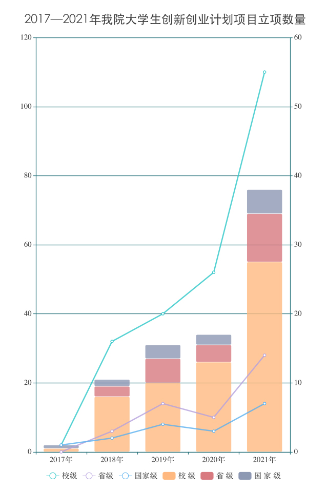领导高度重视、各专业教师积极组织申报,经过学生申报、学院评审排序、学校审批,共获批立项76项。其中,国家级项目7项,省级项目14项,校级立项55项,立项数量与往年相比取得突破性进展。