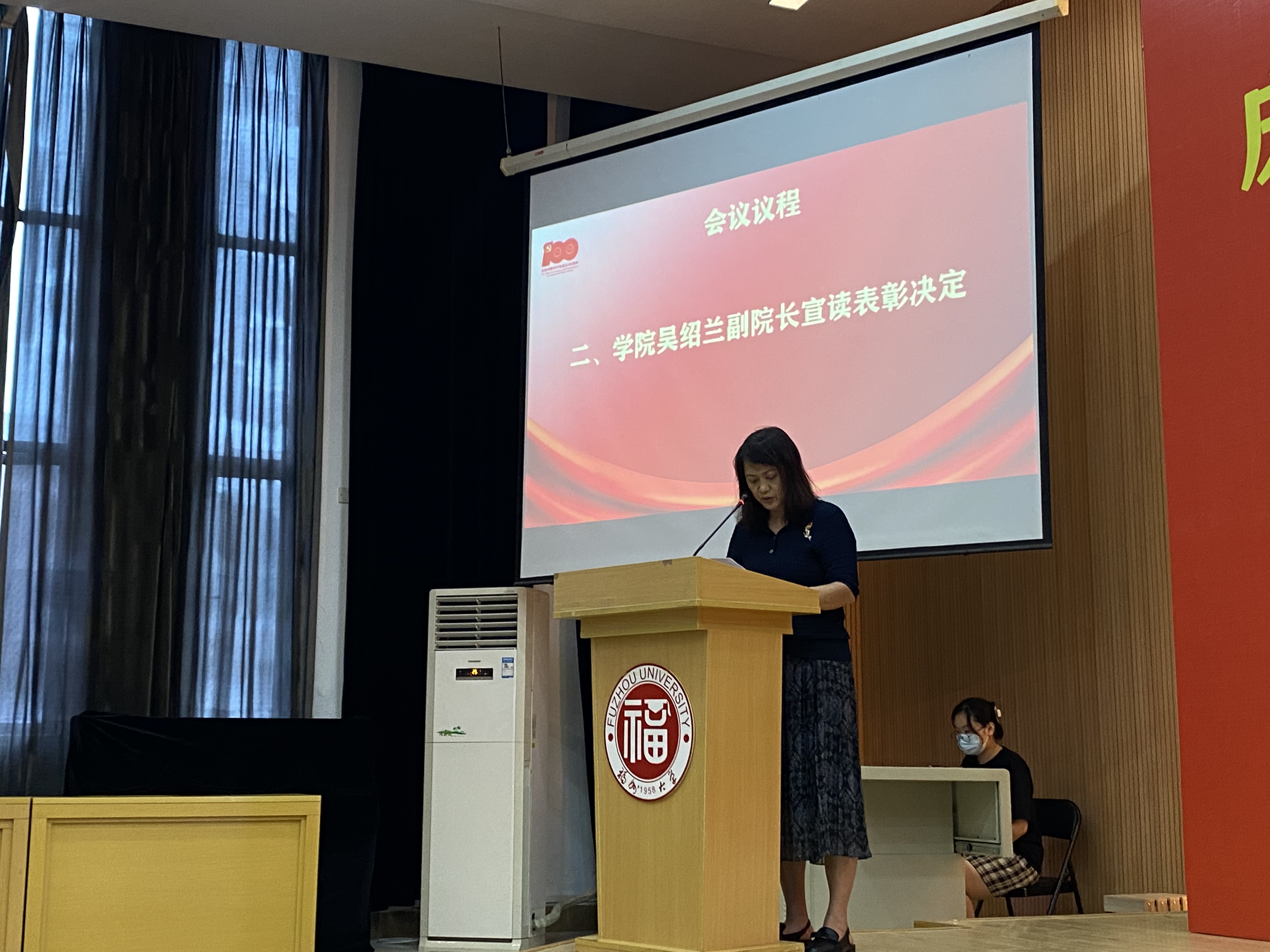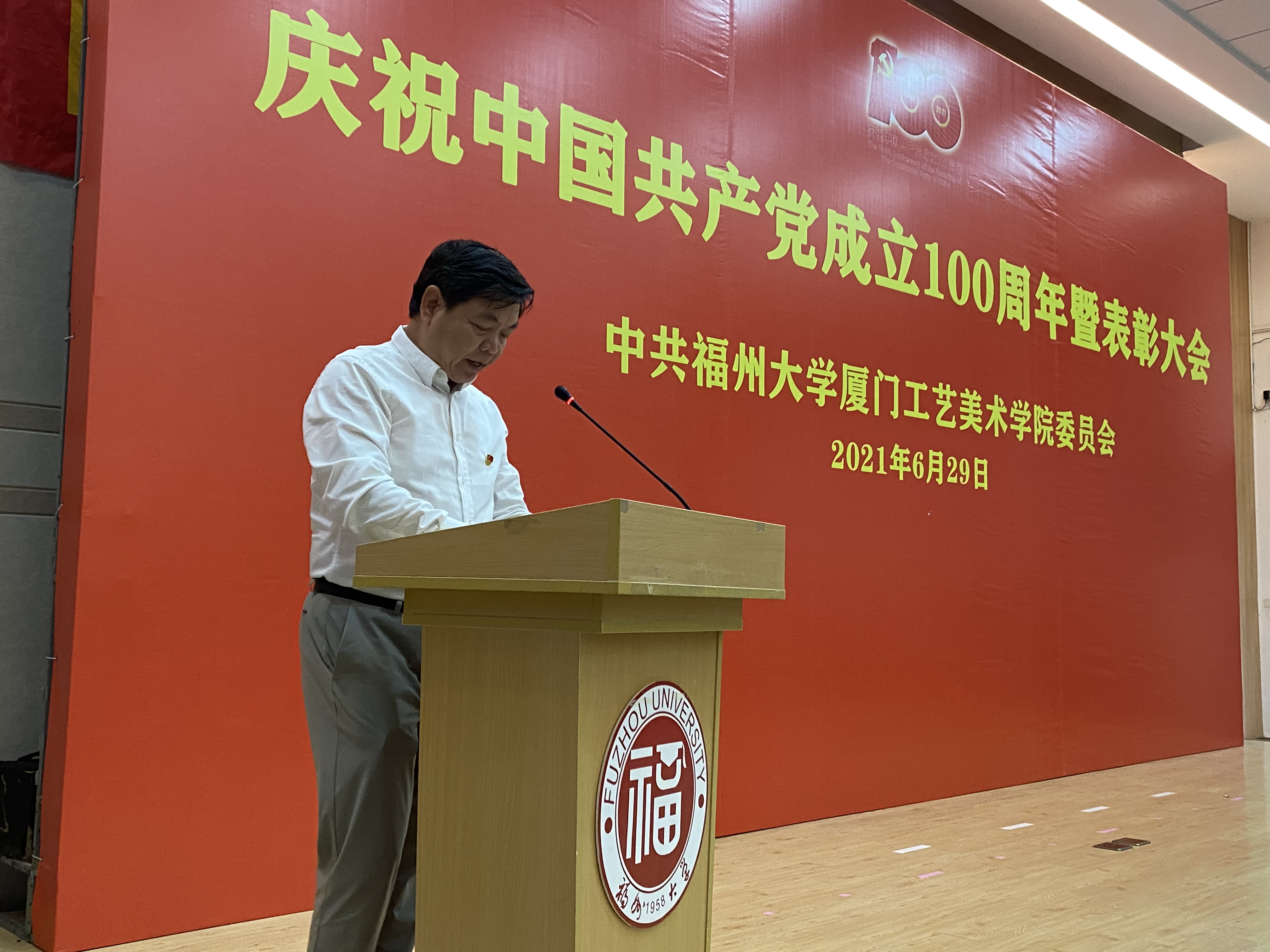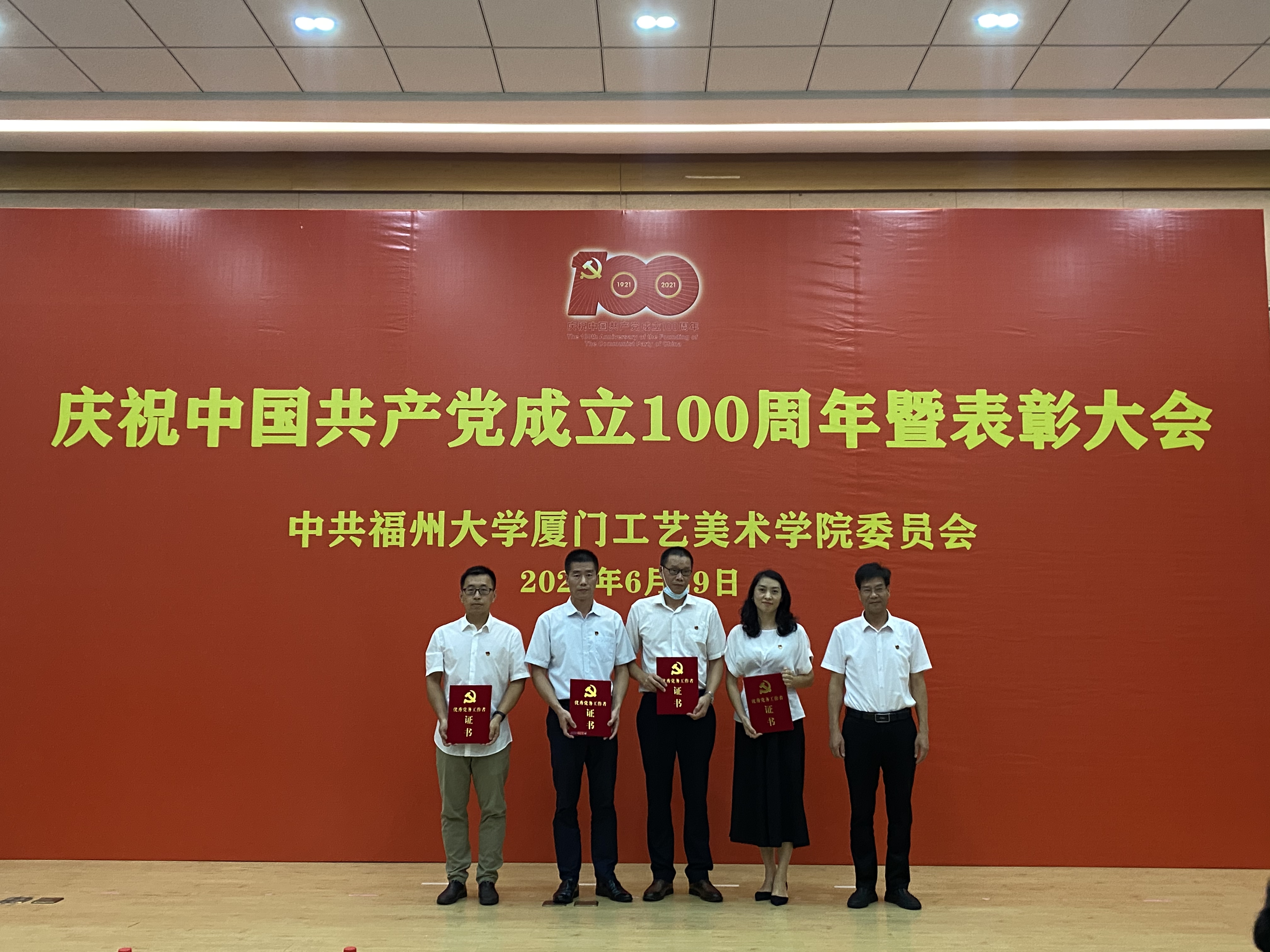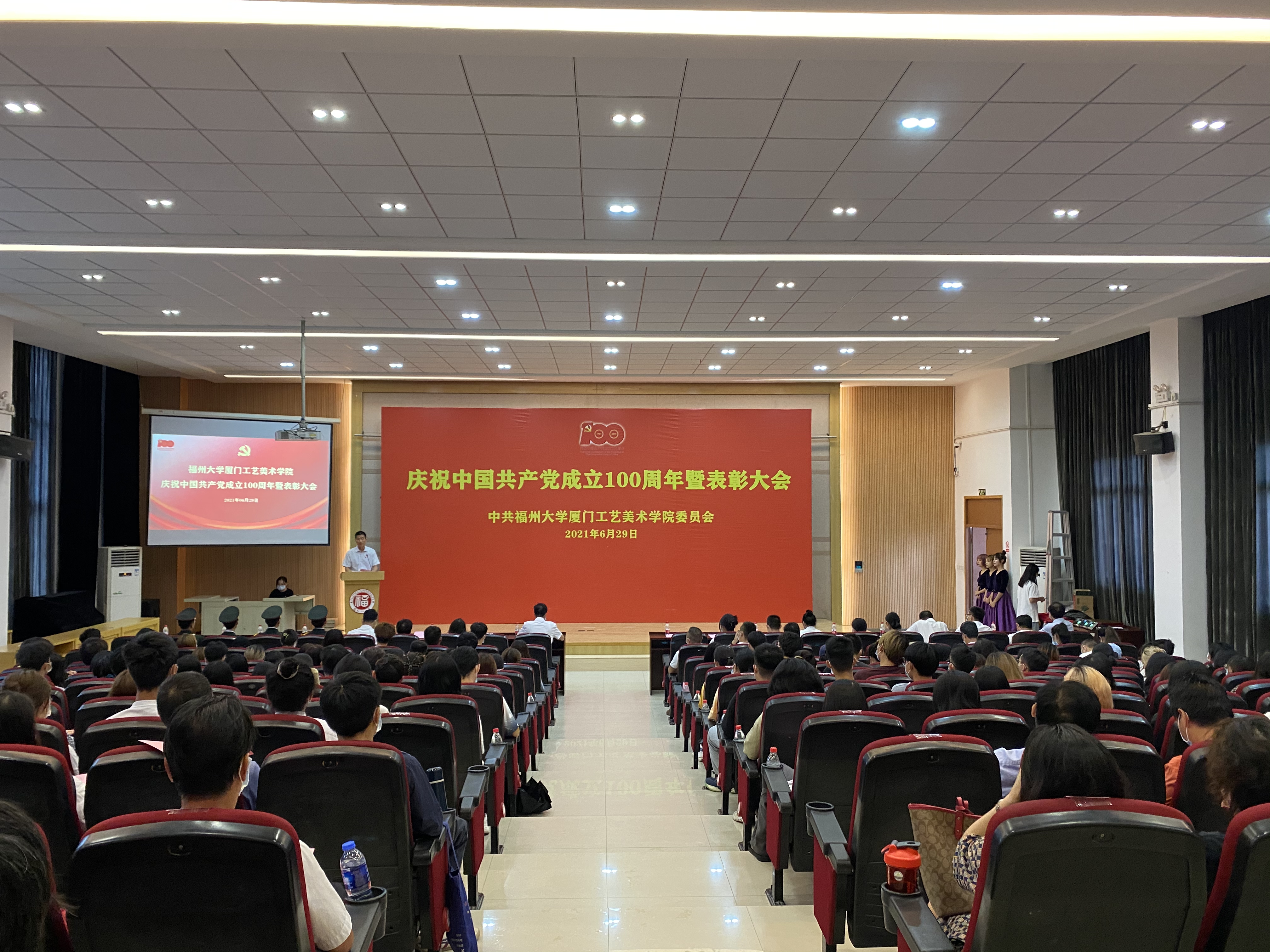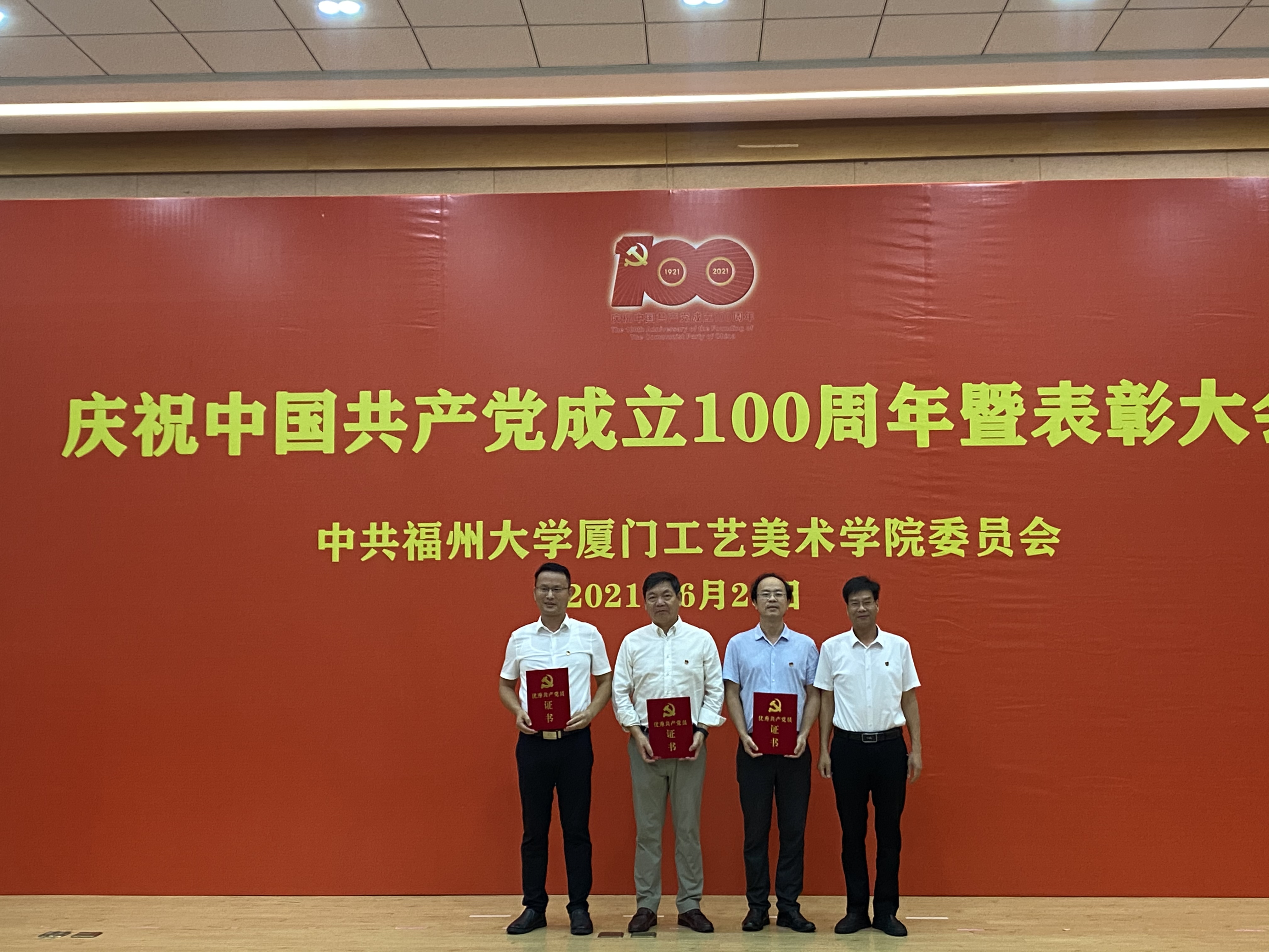 庆祝中国共产党成立100周年暨表彰大会在集美校区隆重举行。大会回顾了中国共产党走过100年的光辉历程,表彰了一批校、院优秀共产党员、优秀党务工作者和先进基层党组织,安排和部署了学院今后的党建工作。全体教职工党员、全体预备党员、部分学生党员代表参加大会,大会由学院党委林旭副书记主持。